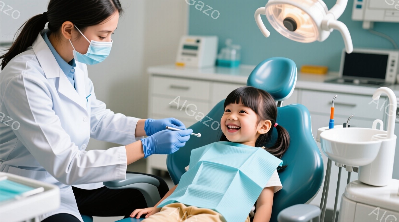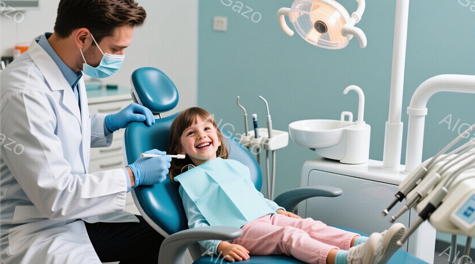 1. 男性歯科医は白衣、マスクを身につけたままで、手術台の上で女児の患者を治療している。 2. 女児の患者は笑顔で歯科治療中であり、歯科医による治療室の環境で受けている治療を受け入れている。 3. 背景は明るく清潔な歯科治療室で、プロフェッショナルな設備が用意されており、治療中に必要な機器も確保されている。