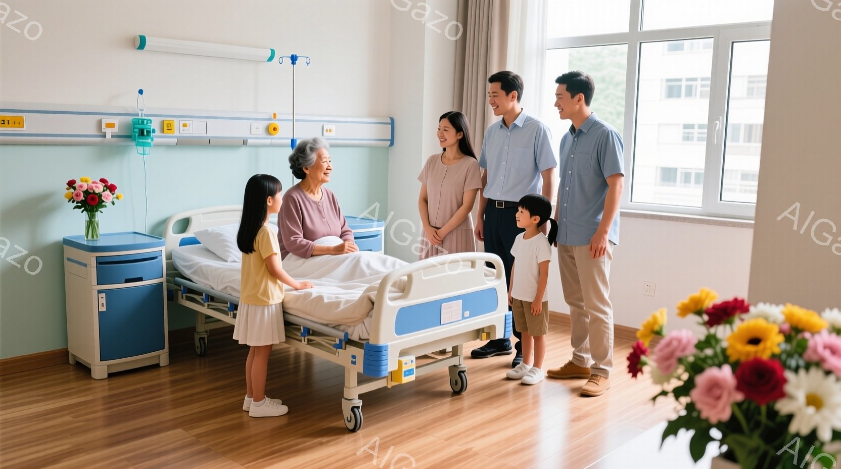 病院のベッドの周りには、笑顔の高齢女性と、彼女を見つめる若いカップルと二人の子供たちがいます。高齢女性はピンク色のカーディガンを着ており、子供たちはそれぞれ黄色とピンクのTシャツを着ています。背景には、明るい自然光が差し込む窓と、医療機器が見え、全体的に温かく、希望に満ちた雰囲気が漂っています。