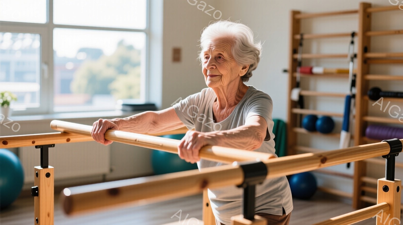 白髪の女性が、明るい室内でバレエのバーを握り、少し前かがみの姿勢で立っている。彼女は水色のTシャツと黒いズボンを着用しており、穏やかで少し物憂げな表情をしている。背景には運動器具や窓から見える緑の芝生と建物があり、穏やかで健康的な雰囲気を醸し出している。