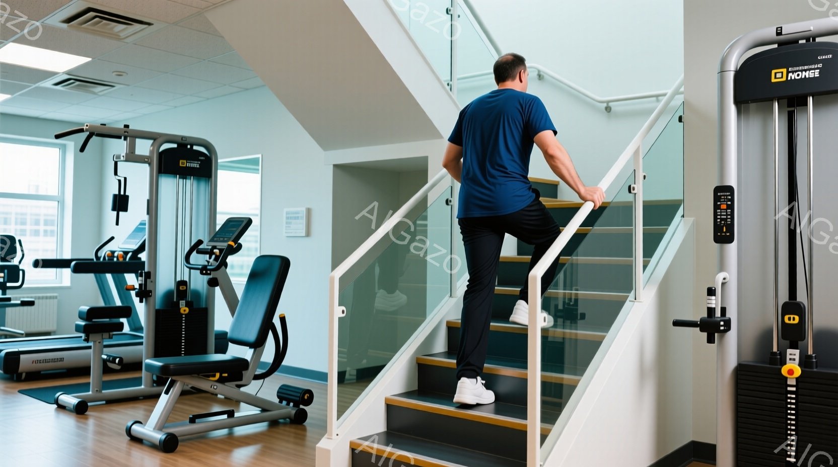 筋力トレーニングジムで、青いTシャツと黒のショーツ、スニーカーを履いた男性が階段状のトレーニングマシンを使用している。彼は背中を丸め、手すりに掴まりながら一段ずつ登っている様子で、集中した表情からは運動への真剣な取り組みが窺える。ジム内は明るく清潔で、他のトレーニング機器も配置されており、活気のある雰囲気である。