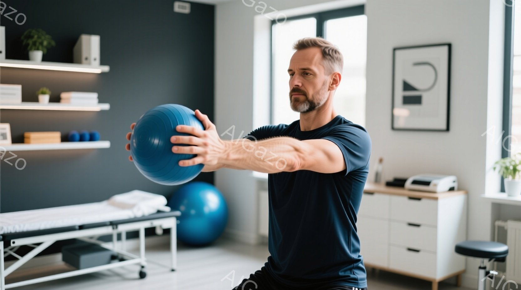 灰色の髪の男性が、青いエクササイズボールを両手で前に掲げてスクワットの姿勢を取っています。彼は青いTシャツと黒いショーツを着ており、真剣な表情をしています。背景には、医療機器や棚が置かれた明るい部屋が広がっており、リハビリテーションやトレーニングの環境を示唆しています。