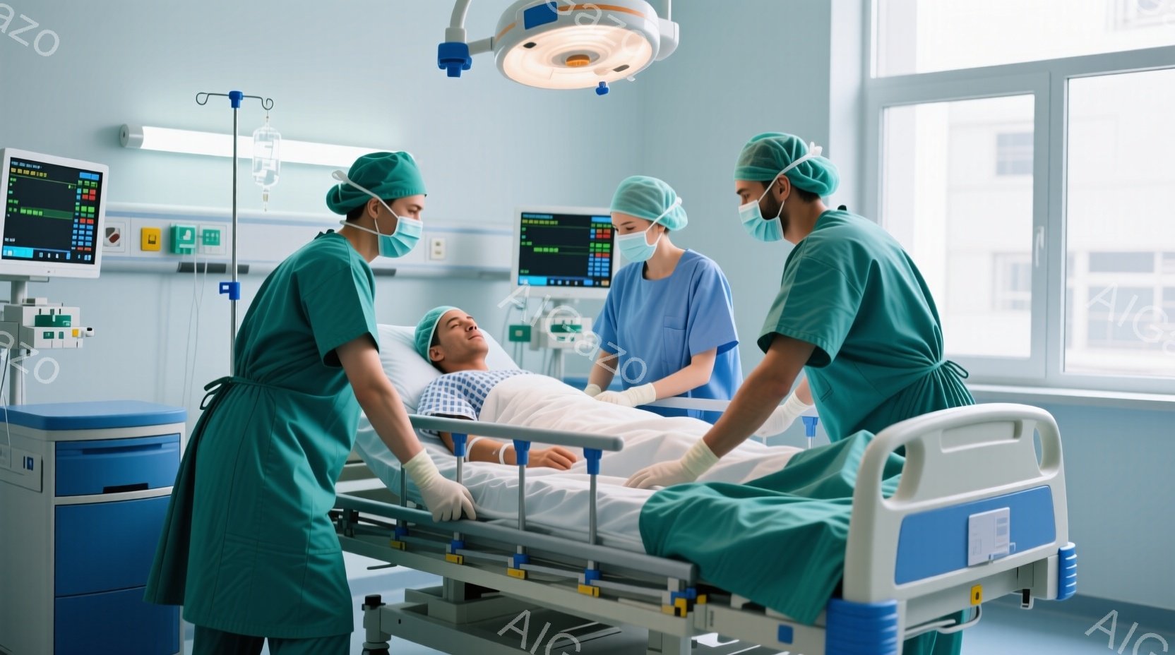 病院のベッドに横たわる患者の傍らには、手術着と帽子、マスクを着用した二人の医療従事者が立っている。患者は眠っているか意識不明のようで、医療従事者は患者の状態を確認しているようだ。背景には医療機器やモニターが並び、清潔で落ち着いた雰囲気が漂っている。