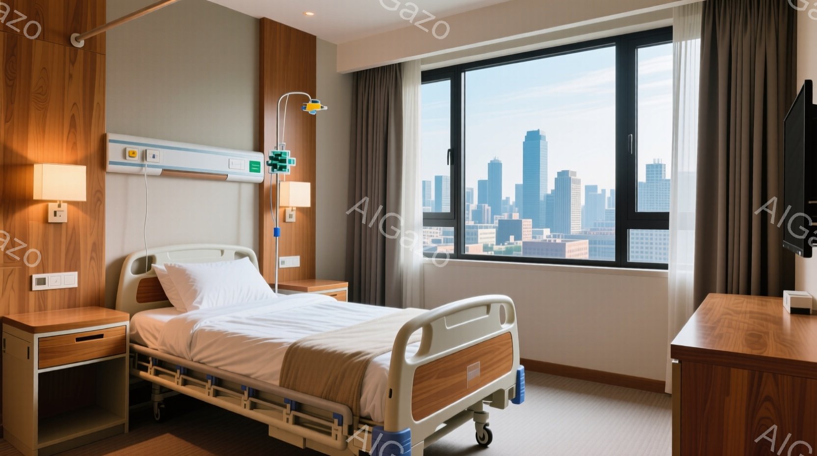 高齢の男性が病院のベッドに横たわっており、白い病院着を着ています。彼は目を閉じ、穏やかな表情をしています。背景には大きな窓があり、高層ビルが見え、全体的に静かで落ち着いた雰囲気が漂っています。
