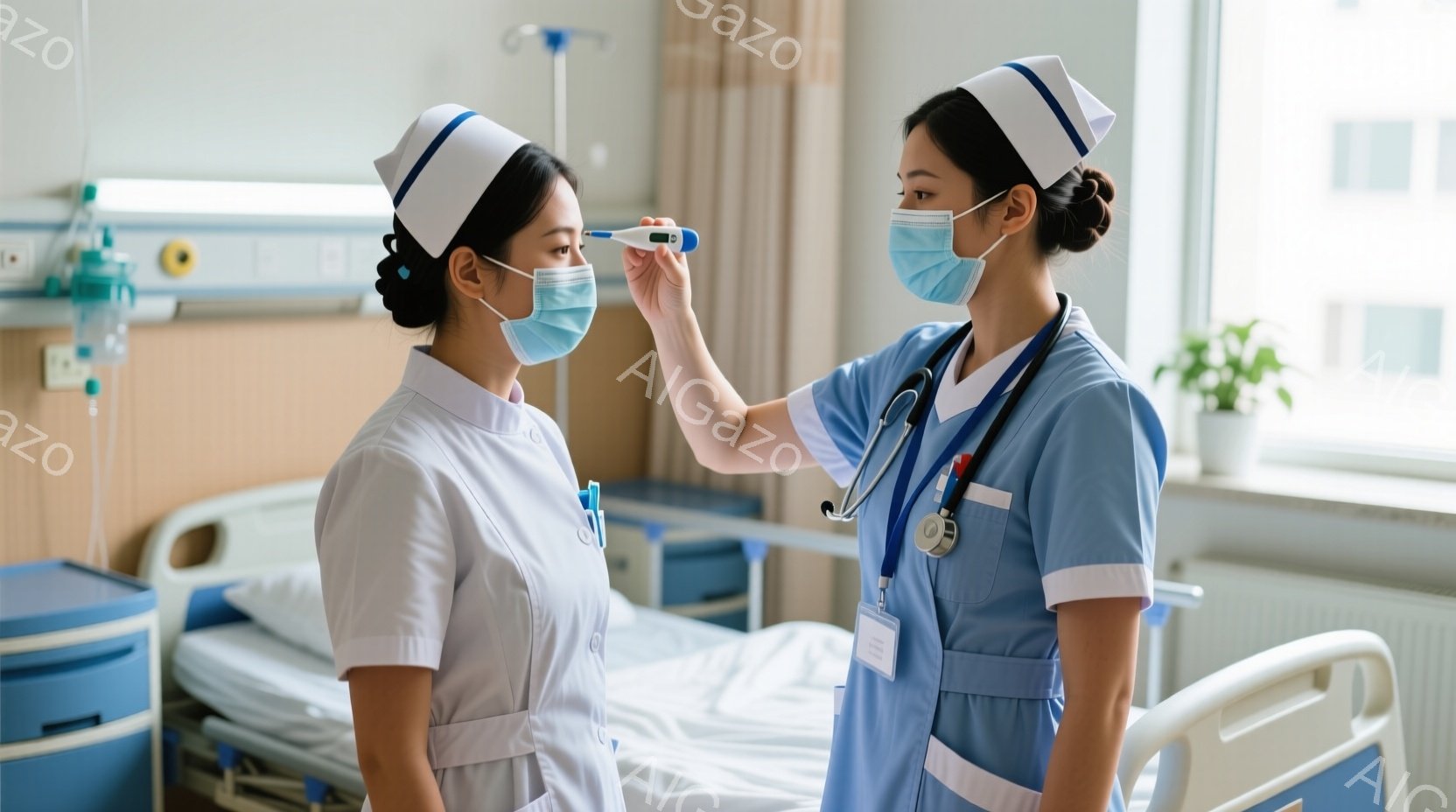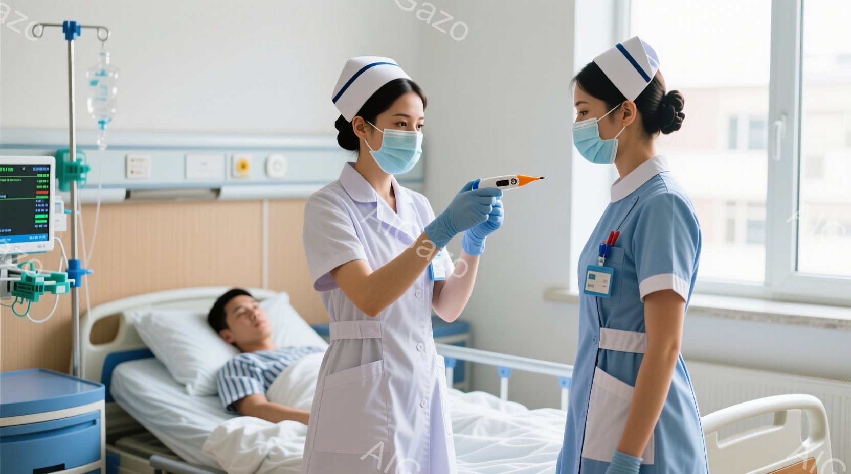 看護師はマスクとスクラブ、聴診器を身につけ、体温計を患者に向かって伸ばしています。患者は病院のベッドに横たわり、青い病衣を着ています。背景には、医療機器やモニタがあり、病院の静かで清潔な雰囲気が漂っています。