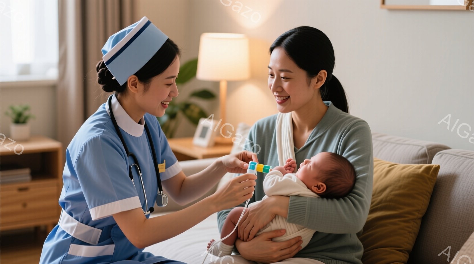 看護師は白地にピンクのラインが入った制服と帽子を着用し、赤ちゃんの口の中に何かを挿入しようとしています。母親はグレーのTシャツを着て、赤ちゃんを抱きかかえ、微笑んでいます。背景には、木製の棚とクッションが置かれたソファがあり、暖かく穏やかな家庭の雰囲気が漂っています。