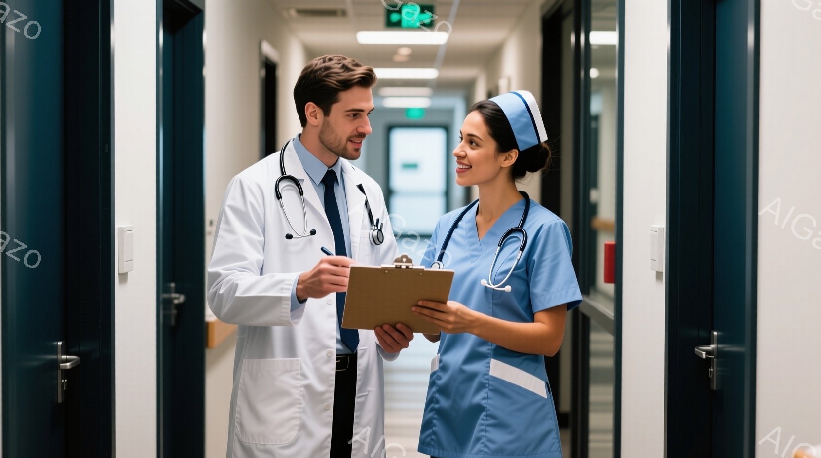 白衣を着た男性医師と、ターコイズブルーのスクラブを着た女性看護師が廊下で話しています。医師はクリップボードを持って何かを確認しており、やや真剣な表情をしています。廊下は病院の内部で、白を基調とした清潔な空間が広がっています。