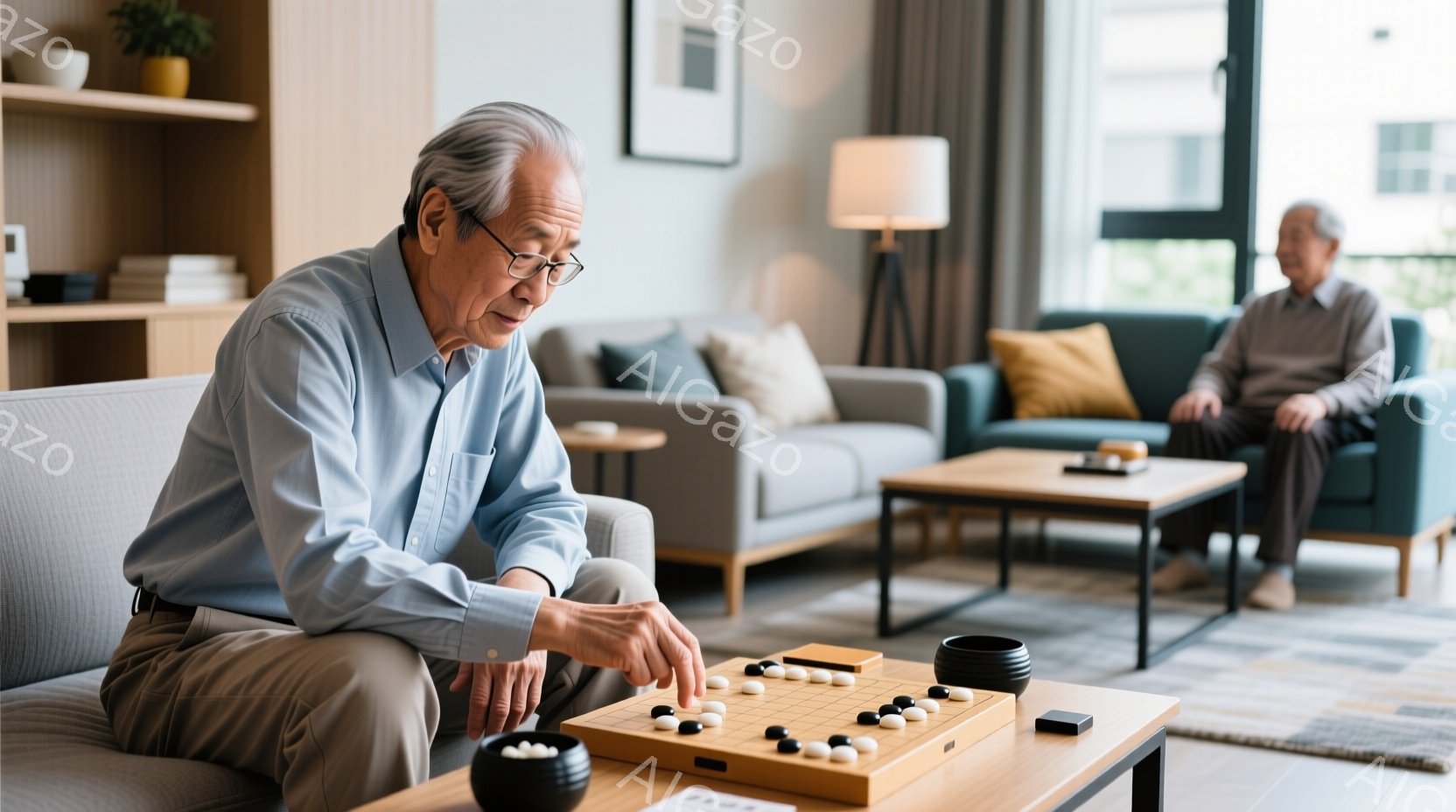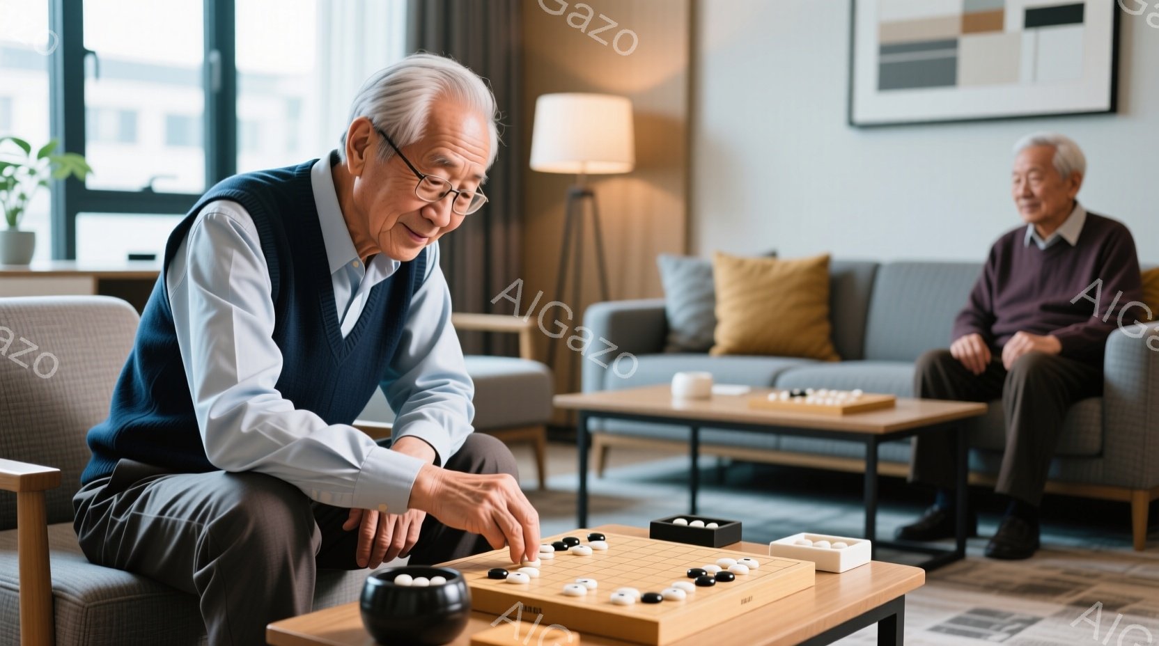 白髪で眼鏡をかけた高齢男性が、灰色のセーターを着て、囲碁の石を囲碁盤に置こうとしているところです。彼はソファに座って集中した表情でゲームに取り組んでおり、近くにはもう一人の男性がリラックスして座っています。背景には、モダンなリビングルームのインテリア、明るい窓、観葉植物が見え、穏やかで落ち着いた雰囲気が漂っています。