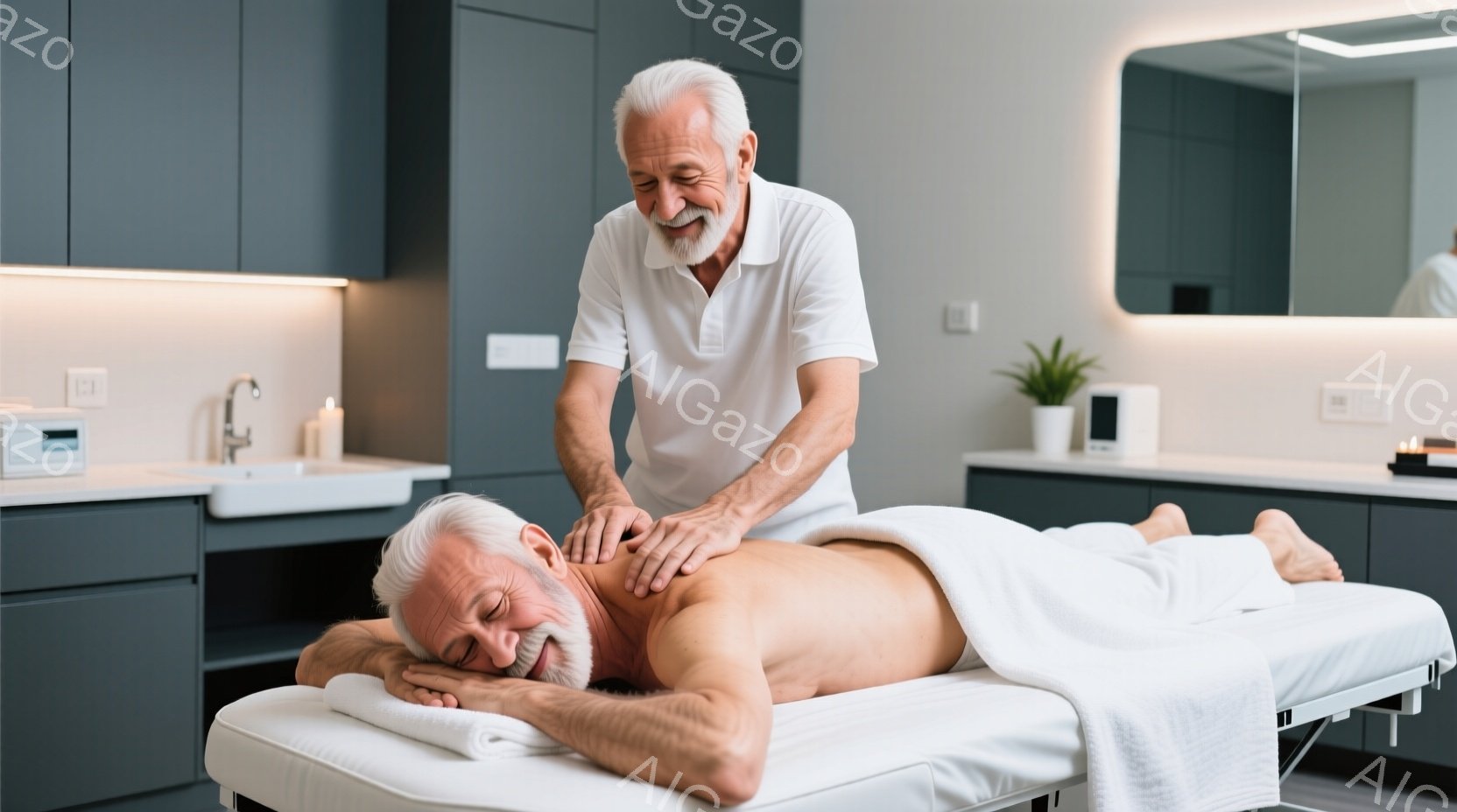 白髪の男性が、白いマッサージベッドにうつ伏せになり、タオルで肩や背中を覆っています。もう一人の白髪の男性が青いスクラブを着て、うつ伏せになっている男性の背中をマッサージしています。背景には明るい色の収納棚と鏡があり、清潔で落ち着いた雰囲気の室内であることがわかります。