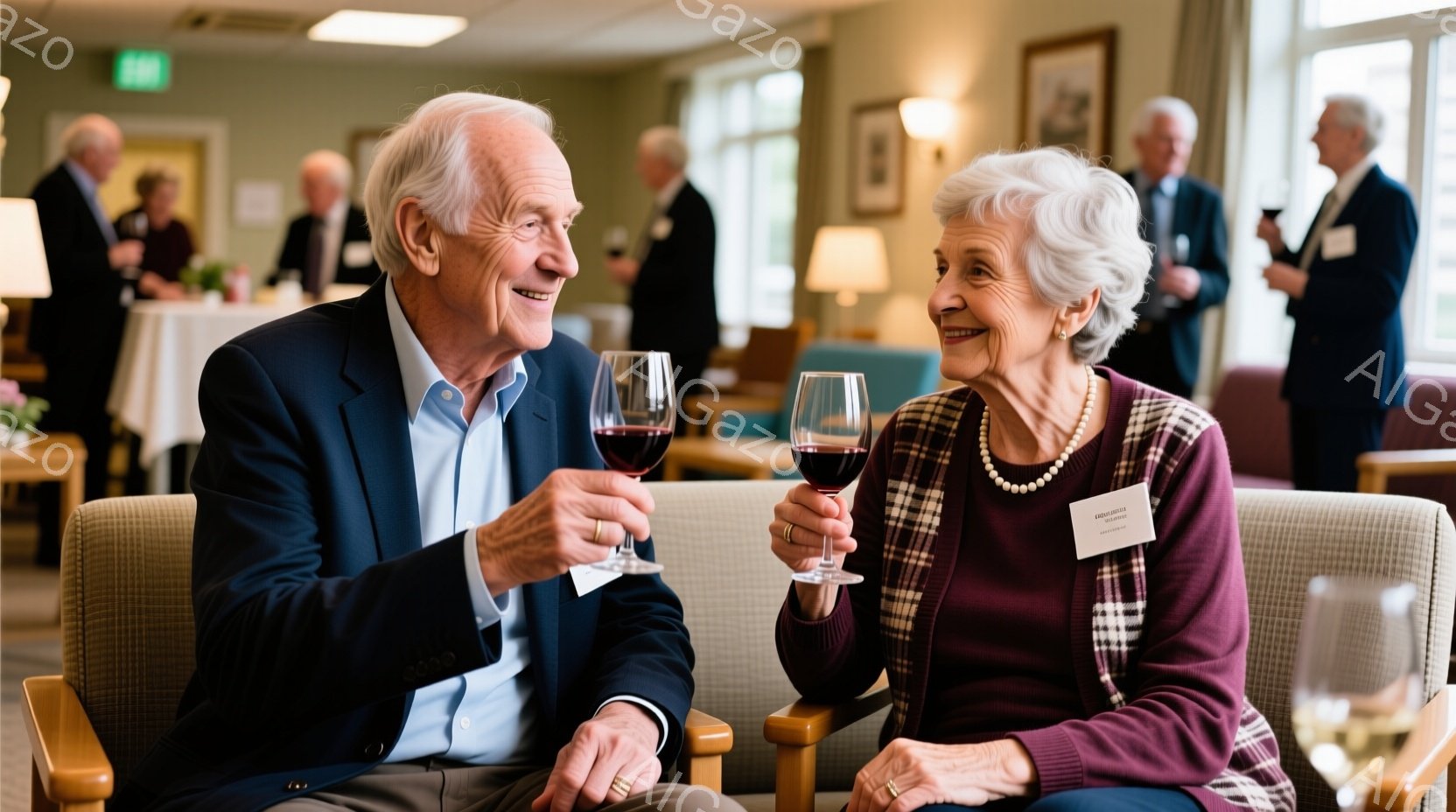 落ち着いた雰囲気の室内でワイングラスを片手に会話を楽しむ、年配の男女が写っています。女性は紫色のセーターに真珠のネックレスを着用し、笑顔で男性を見つめています。男性は紺色のジャケットに薄いブルーのシャツを着ており、女性の方を見て微笑んでいます。