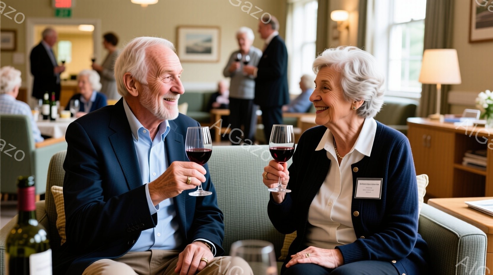 豪華な室内で、上品な女性と紳士がワイングラスを手に笑顔で向かい合っている。女性は紫色のセーターを着ており、短い灰色の髪をしている。紳士は濃い紺色のスーツを着て、微笑みながらワイングラスを掲げている。