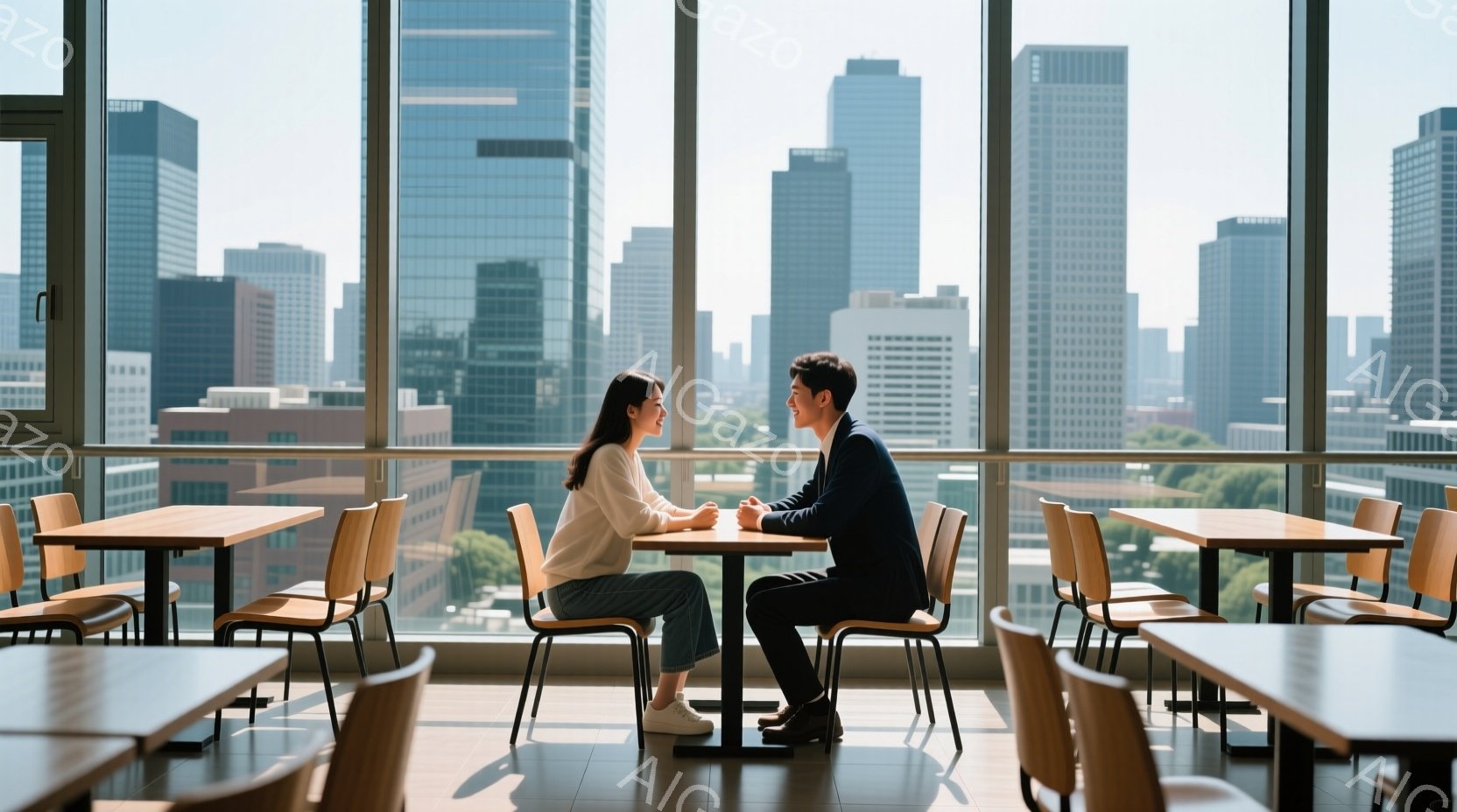 若い男女が大きな窓の前に座って向かい合っています。女性は白いブラウスと茶色のスカートを着用し、男性は濃い青色のセーターと黒いズボンを着用しています。背景には高層ビル群が広がり、晴天で明るい室内空間が、穏やかで親密な雰囲気を醸し出しています。