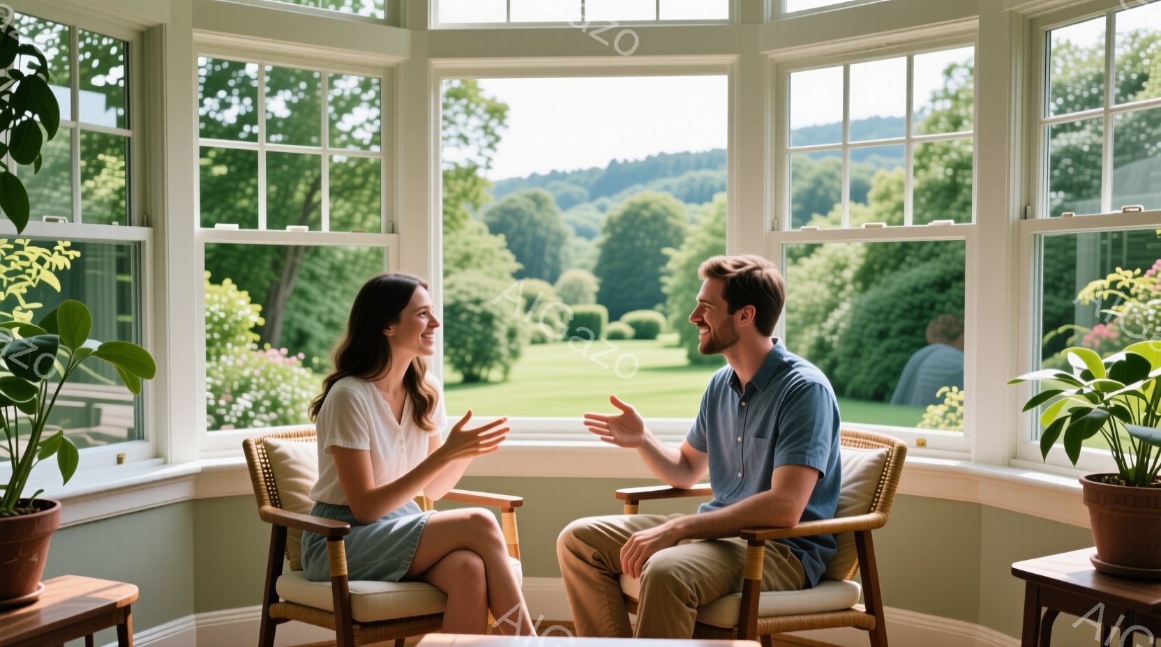窓辺の椅子に座る男女が穏やかに会話をしています。女性は白いワンピースを着ており、少し微笑みながら身振り手振りを交えて話しています。背景には緑豊かな庭園と山々が広がり、晴れた日の穏やかな雰囲気が伝わってきます。
