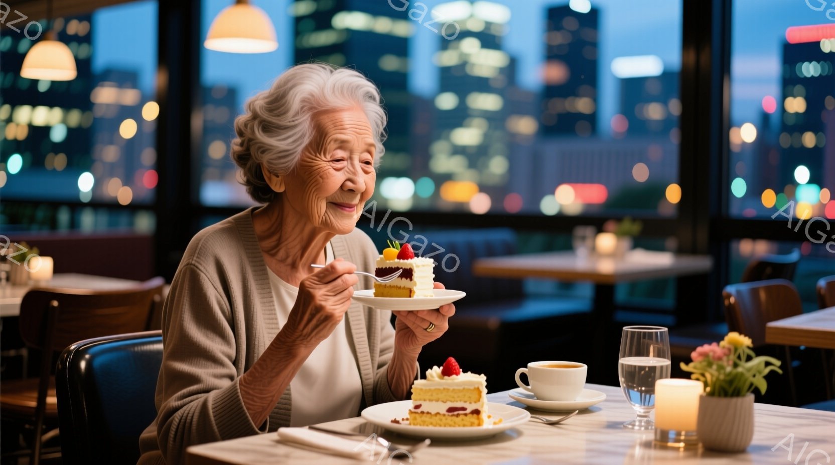 白髪の女性が、赤い実の乗ったケーキをフォークで口に運んでいます。グレーのセーターを着ており、楽しそうな笑顔を浮かべています。背景には、夜景が広がり、暖色系の照明が灯ったレストランのテーブルが並んでいます。
