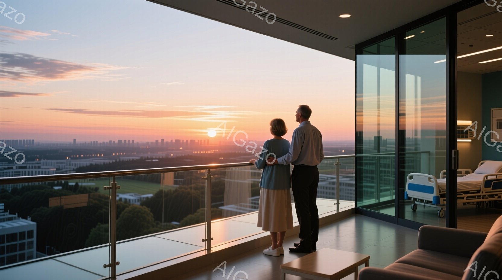 高層ビルの窓辺に、年配の男女が並んで立っている。男性は紺色のシャツにベージュのズボンを、女性は薄いピンクのセーターと薄い紫のズボンを身に着けており、共にリラックスした表情で遠くの街並みを見つめている。窓の外には夕焼け空が広がり、オレンジ色とピンク色のグラデーションが、遠くの建物群と緑豊かな自然を照らし出している。