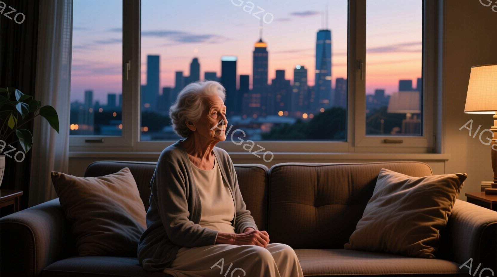 白髪の老婦人が、落ち着いた色のソファに座り、遠くの都市を見つめている。彼女はグレーのセーターを着ており、表情は穏やかで少し物憂げだ。背景には、夕焼けに照らされた摩天楼と、緑豊かな自然が広がっており、静かで郷愁を感じさせる雰囲気だ。