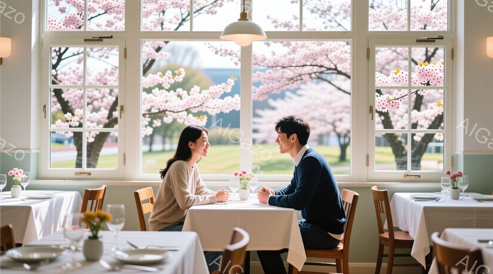 若い男女が、窓の外の桜並木を背景に、白いテーブルを挟んで向かい合って座っています。男性は薄い青色のシャツを着ており、女性は白いセーターとジーンズ姿で、両者とも微笑みながら会話を楽しんでいるようです。室内は明るく、窓からの自然光が差し込み、落ち着いた雰囲気のレストランで、春の暖かさを感じさせます。