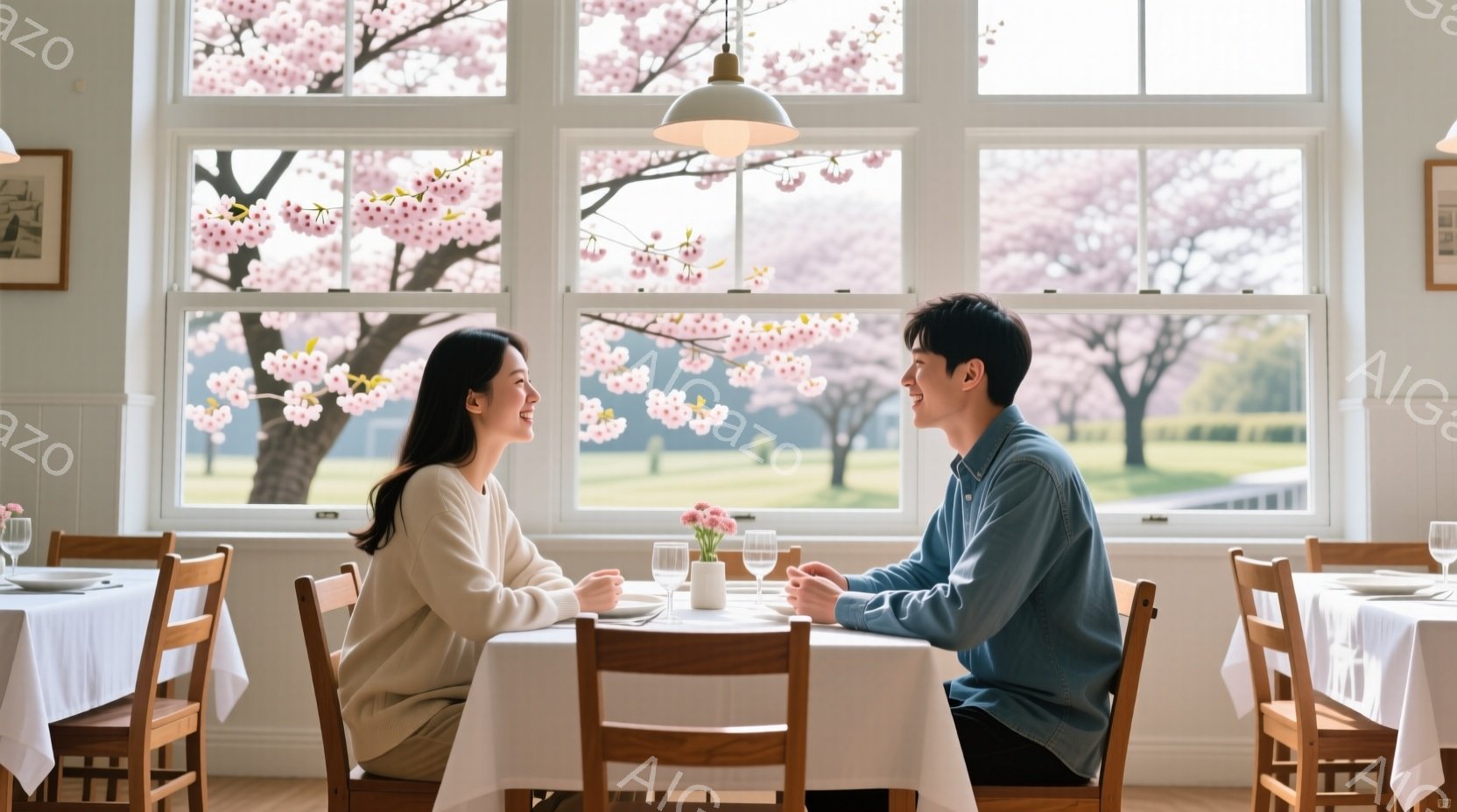 窓の外に桜並木が見えるカフェで、若い男女が向かい合って座っています。男性はデニムジャケットを着ており、女性は白いブラウスとオレンジ色のスカートを着用しています。二人は微笑み、何か話し合っている様子で、暖かく穏やかな雰囲気です。