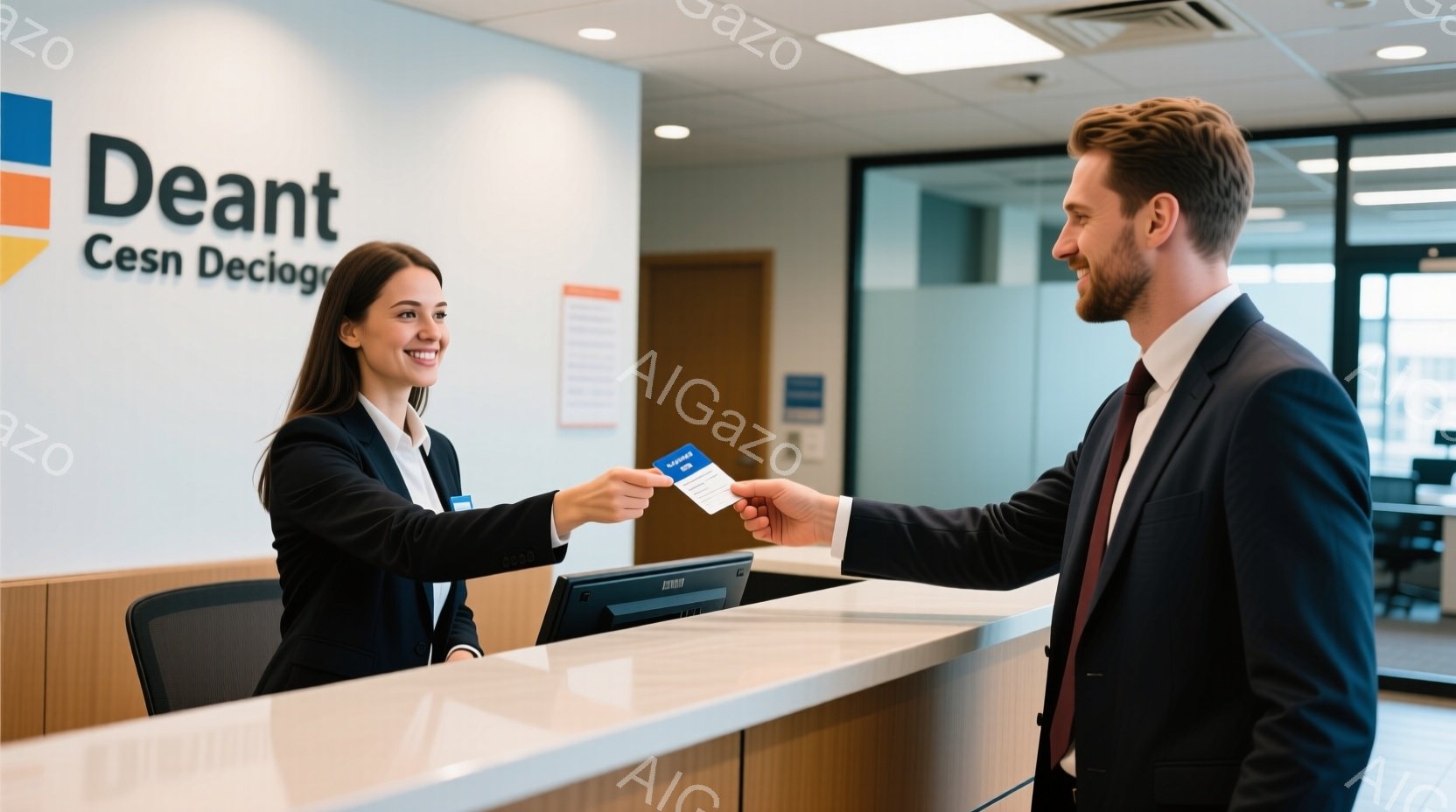 女性は紺色のジャケットと白いブラウスを着ており、笑顔で何かを男性に渡しています。男性は黒いスーツを着ており、受け取る姿勢です。背景には受付カウンターと植物があり、明るく清潔な雰囲気のオフィスやロビーのようです。