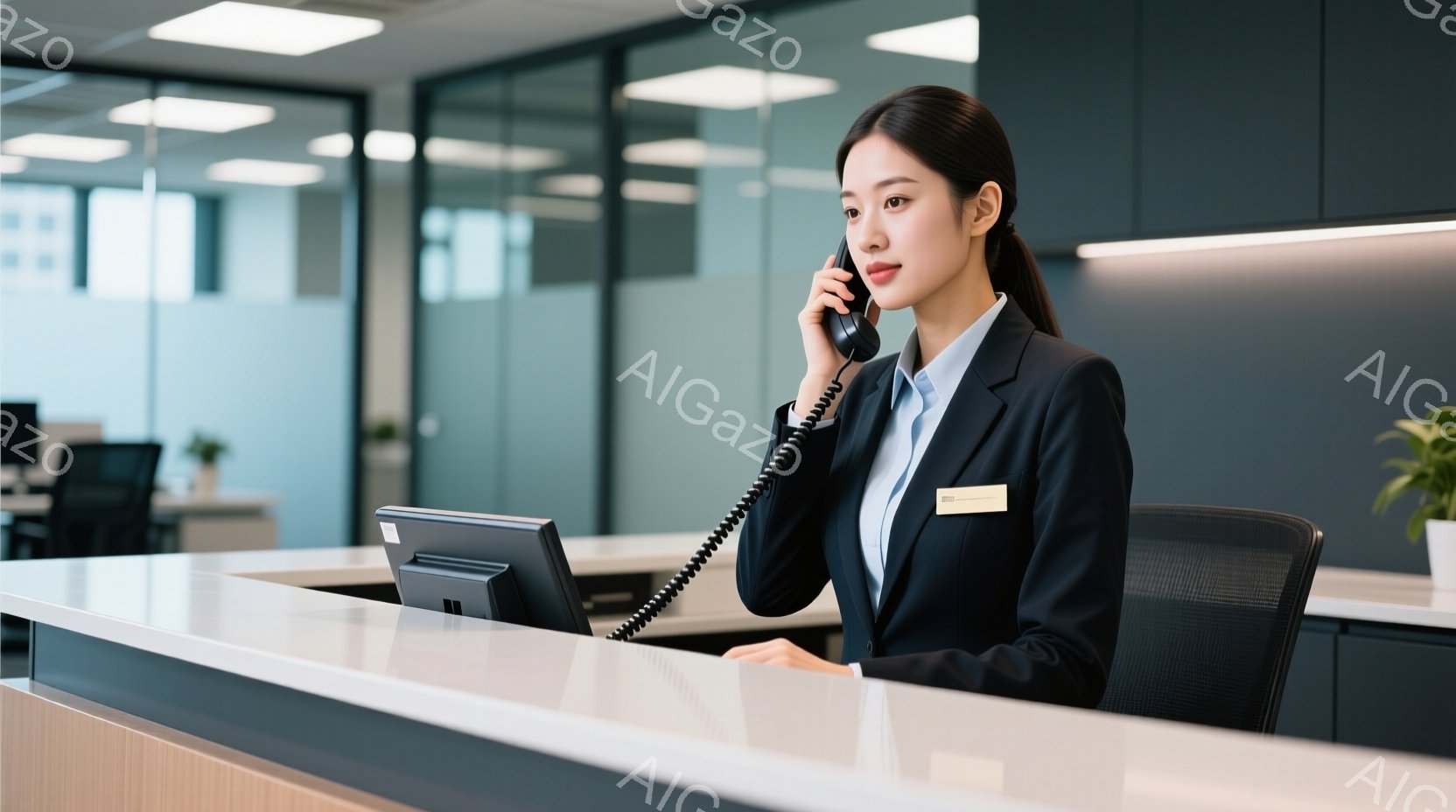 受付カウンターに座る女性は、黒いジャケットと白いシャツを着ており、名札をつけている。彼女は電話をしており、少し前かがみの姿勢で真剣な表情をしている。背景には、オフィススペースが広がり、白い壁と現代的な家具が整然と配置されている。
