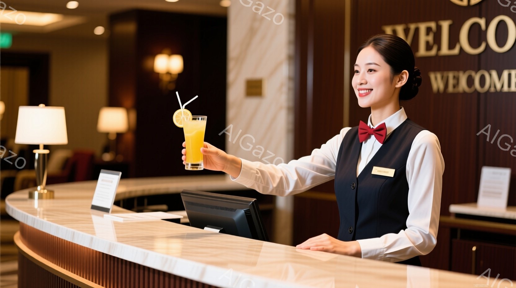 制服姿の女性が、明るいオレンジジュースを手に微笑んでいます。彼女は紺色のベストと白い長袖シャツ、赤いリボンタイを着用し、ベージュ色の帽子を被っています。背景には大理石の受付カウンターと、暖色系の照明、そしてぼんやりと見えるソファ席があり、ホテルやレストランの洗練された雰囲気を醸し出しています。