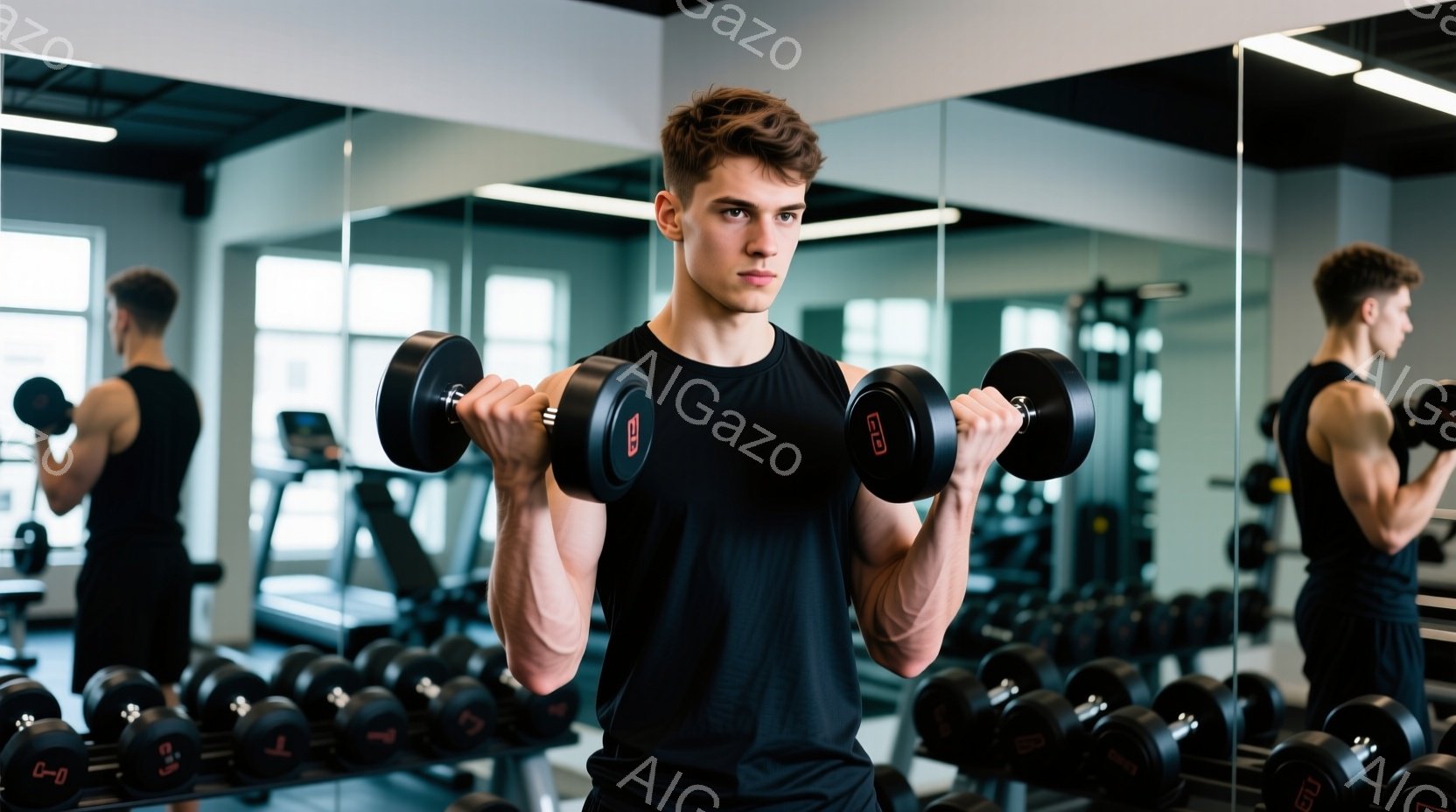若い男性がジムでダンベルを使ってカール運動をしている様子が写っている。彼は黒いタンクトップと黒いショーツを着用し、短く整えられた黒髪と真剣な表情をしている。ジム内には様々なトレーニング器具が並び、鏡に映る彼の姿が繰り返されている。
