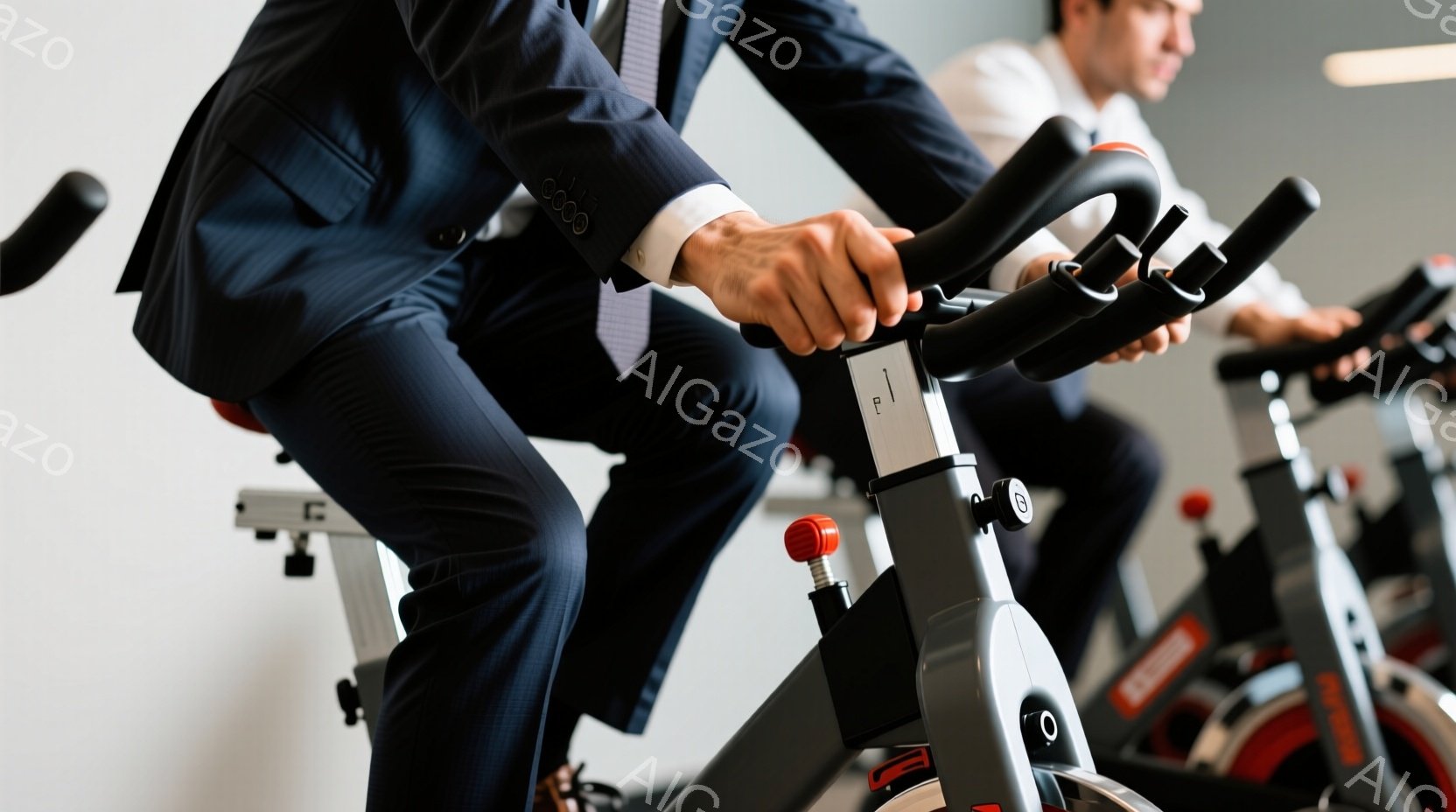スーツ姿の男性が、フィットネスバイクで運動している様子が写っている。彼はネクタイを締め、茶色の革靴を履き、真剣な表情でペダルを漕いでいる。背景はシンプルなジムの空間で、白い壁と他のバイクがぼやけて見える。