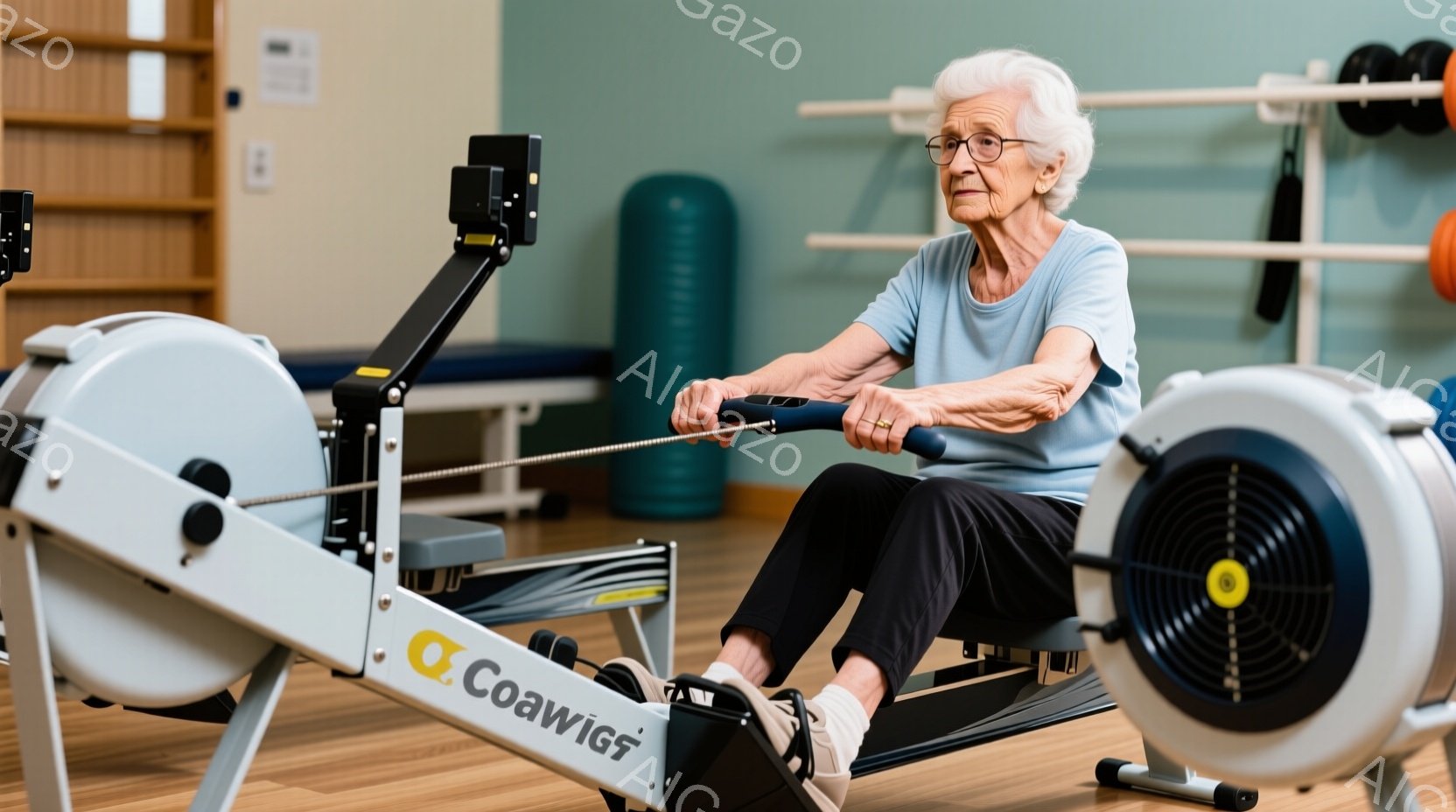 白髪の高齢女性が、室内トレーニングジムでローイングマシンを使用している様子が写っている。彼女は青いTシャツと黒いショーツ、白いスニーカーを着用し、集中した表情でマシンを漕いでいる。背景には、様々なフィットネス器具や壁があり、室内は明るく清潔な印象を与える。