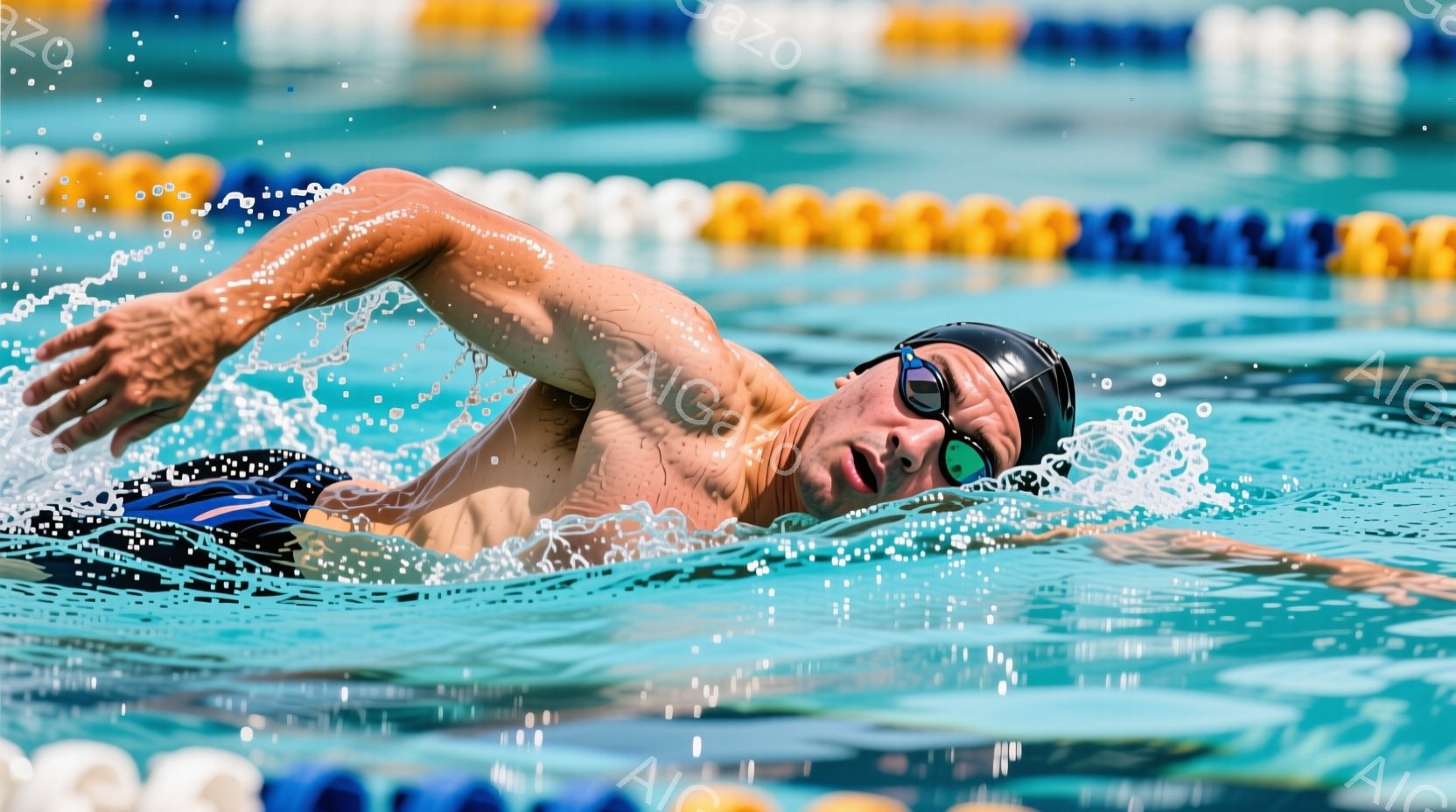 水泳競技者が水中でクロール泳法で泳いでいる様子が捉えられています。彼は筋肉質で日焼けした体つきをしており、黒い水着を着用しています。背景には、水面の反射とプールのタイルが見え、競技場の雰囲気を感じさせます。