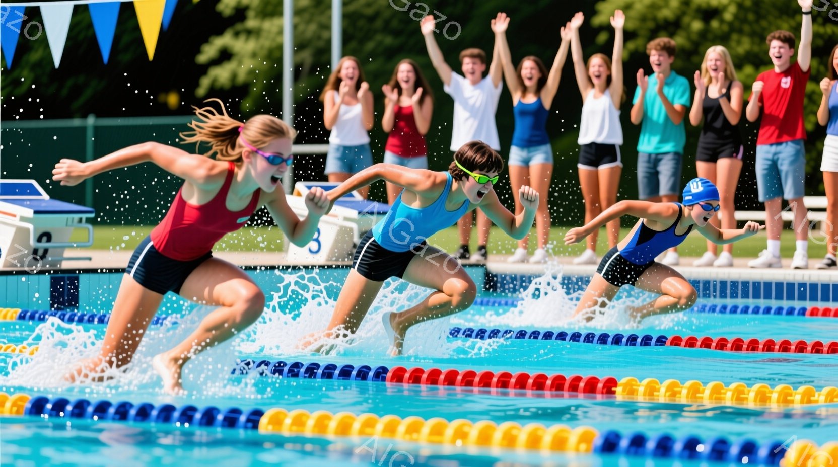 水泳競技の様子が写っており、3人の子供たちがプールの中でスタートを切った瞬間を捉えている。子供たちはそれぞれ異なる色の水着とゴーグルを着用し、水しぶきを上げながら前進している。背景には観客席と旗、そして青空と緑の木々が見え、活気ある夏の競技会の雰囲気が伝わってくる。