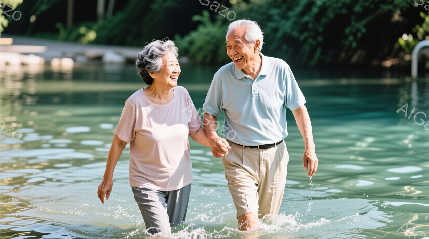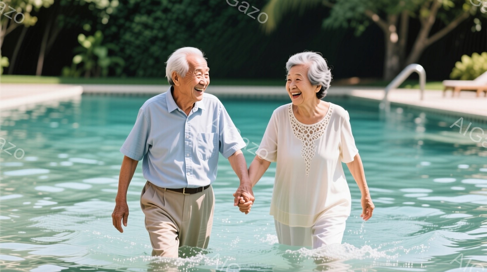 白髪の老夫婦がプールの中で手をつないで歩いています。女性はクリーム色のシャツとベージュ色のズボンを着用し、男性は水色のシャツとグレーのズボンを着用しています。背景には緑の茂みと青空が見え、水面には太陽光が反射してキラキラと輝いており、穏やかで幸せな雰囲気が漂っています。