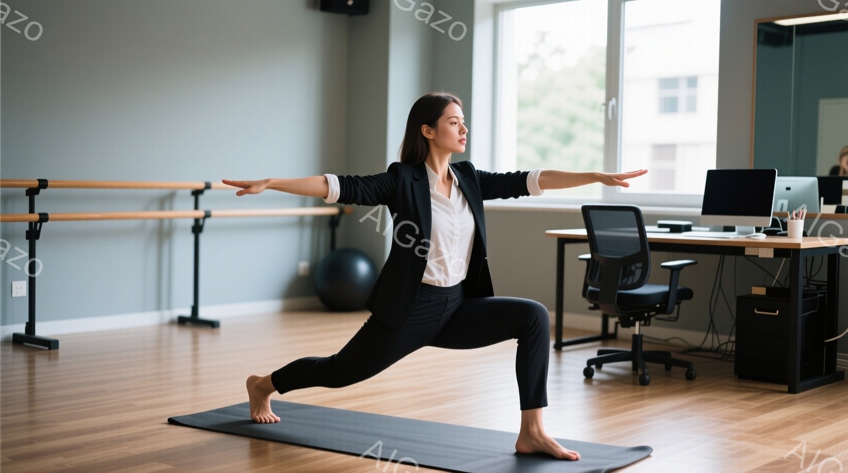 ヨガマットの上で、女性が片足を大きく前に踏み出し、腕を横に広げたランジのポーズを取っています。彼女は白シャツに黒いジャケットとレギンス姿で、髪は後ろでまとめられています。背景には、オフィススペースと鏡があり、自然光が差し込んで明るい雰囲気です。