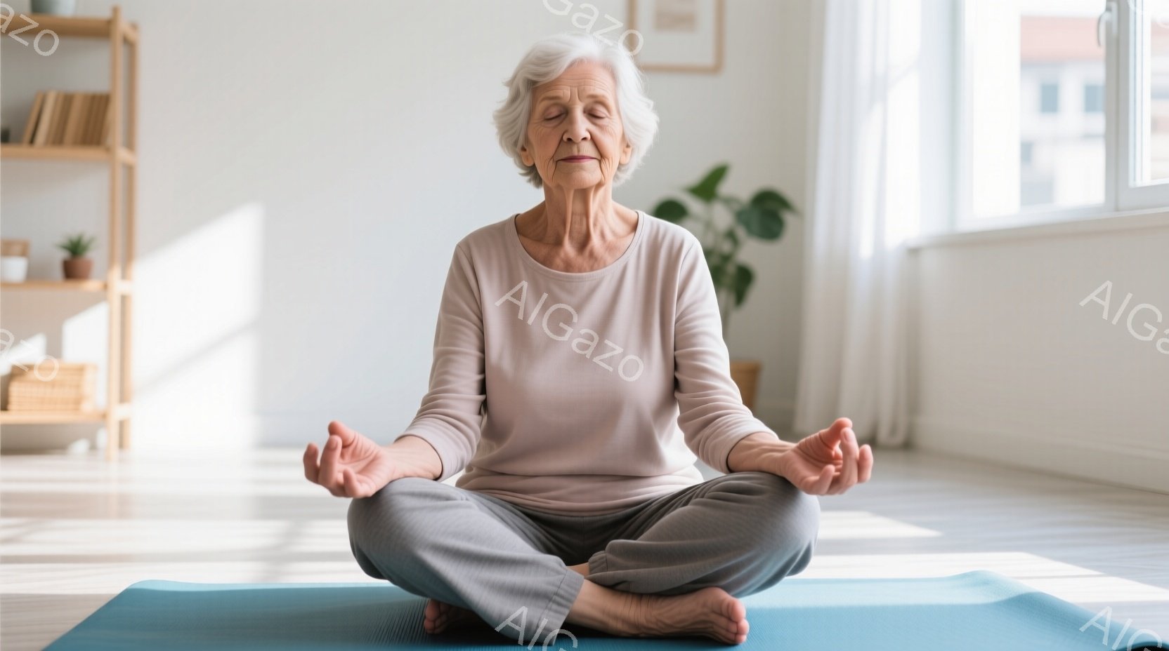 白髪の女性が、紫色のヨガマットの上で瞑想のポーズをとっています。グレーのTシャツとゆったりとしたズボンを身に着け、穏やかな表情で目を閉じています。背景には木製の棚と窓があり、室内は明るく、静かで穏やかな雰囲気が漂っています。