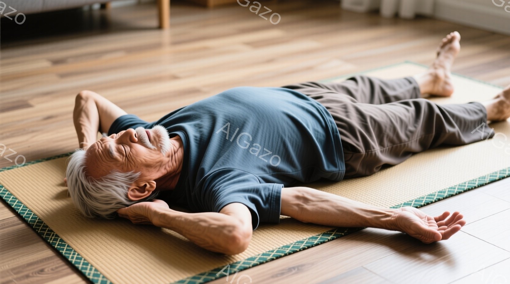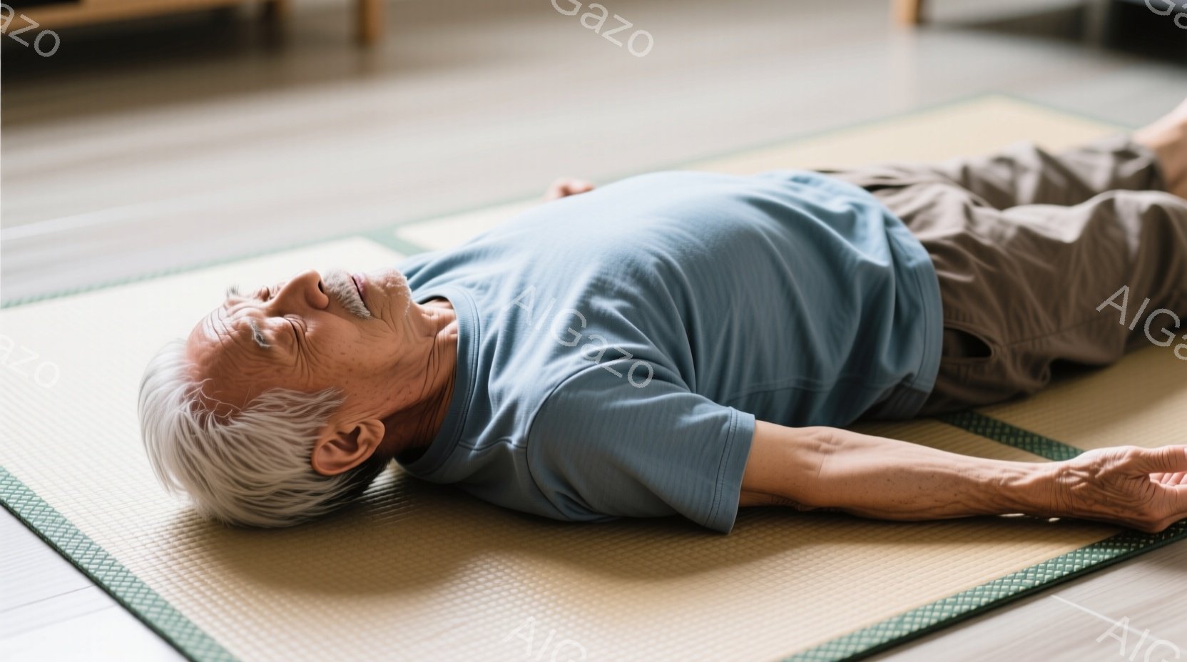 白髪で口髭を生やした高齢男性が、畳の上に仰向けに横たわっています。彼は水色のTシャツとベージュのズボンを身に着け、両腕を広げてリラックスした様子です。背景には木製の棚と観葉植物が見え、室内は明るく穏やかな雰囲気です。