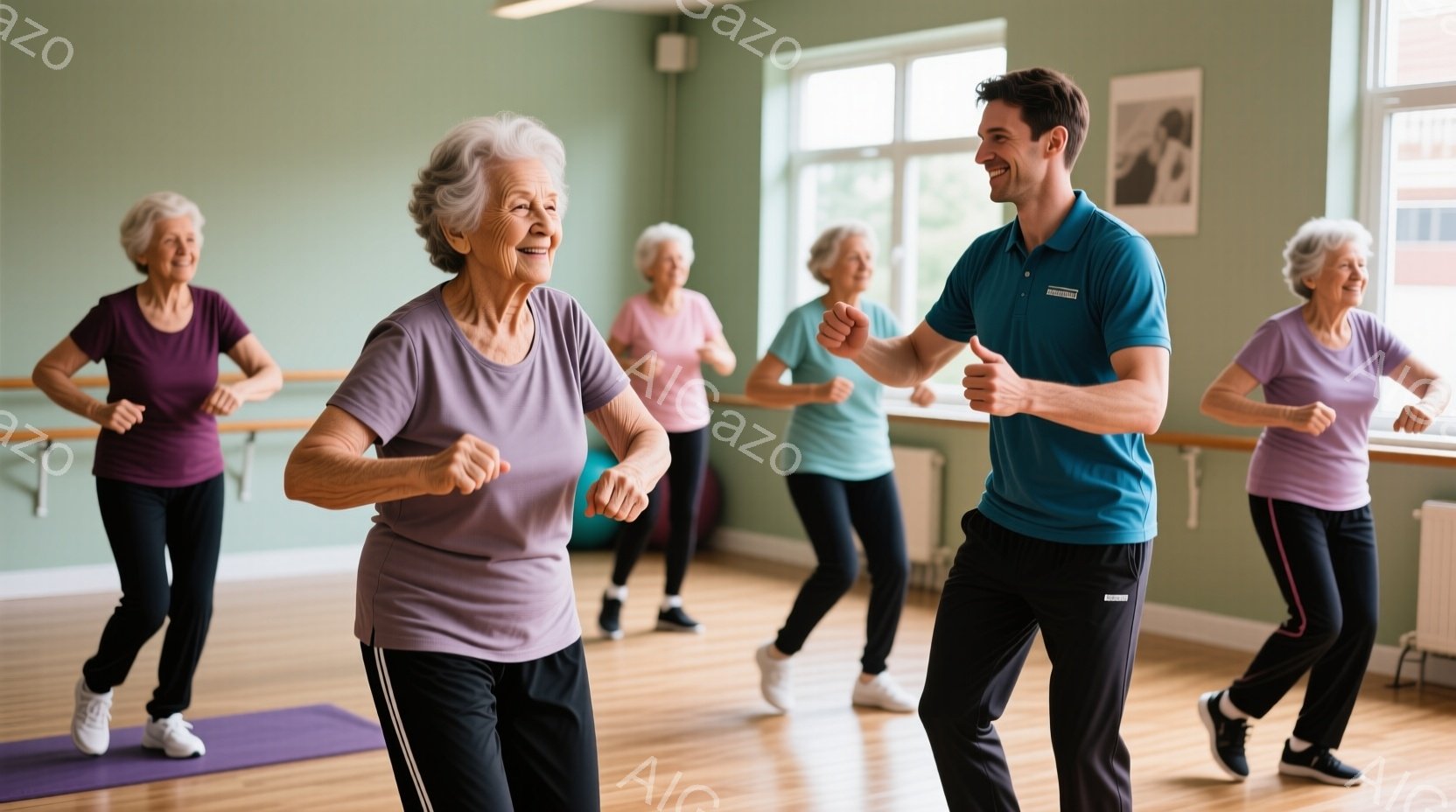 複数の女性と一人の男性が、明るいスタジオでエアロビクスの運動をしている様子が写っている。女性たちはカラフルなトップスと黒いズボンを着用し、笑顔で腕を振りながら運動している。スタジオにはバレエバーやエクササイズボールがあり、木製の床が敷かれていることで、リラックスした雰囲気が漂っている。