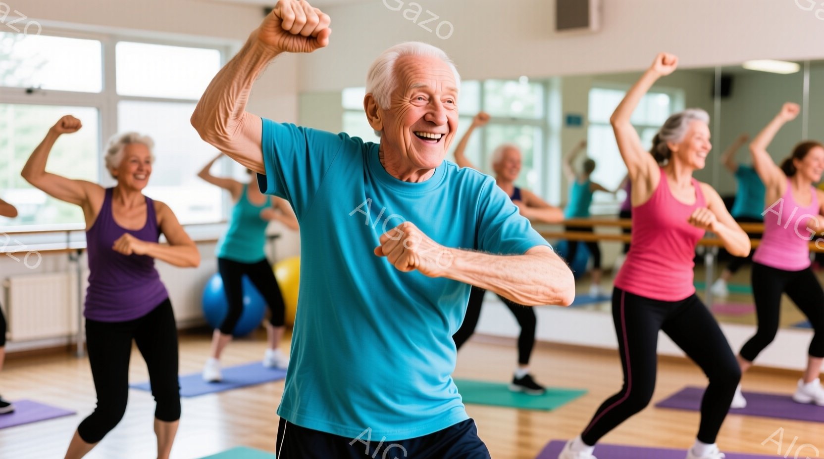 鮮やかな青いシャツと紺色のショートパンツを着た高齢男性が、両手を上げて元気に踊っています。周りにはピンクや紫色のタンクトップを着た高齢女性たちが、同じように手を上げながら運動しています。背景には鏡とエクササイズマットがあり、室内で活気に満ちたエクササイズクラスが行われている様子が伺えます。