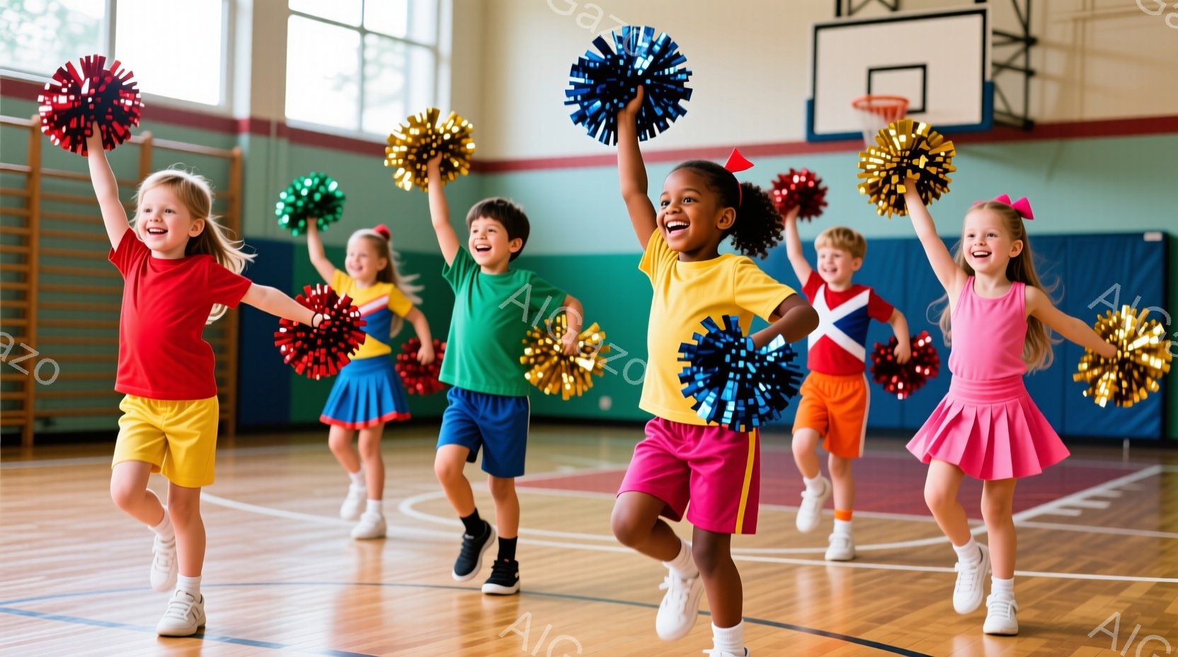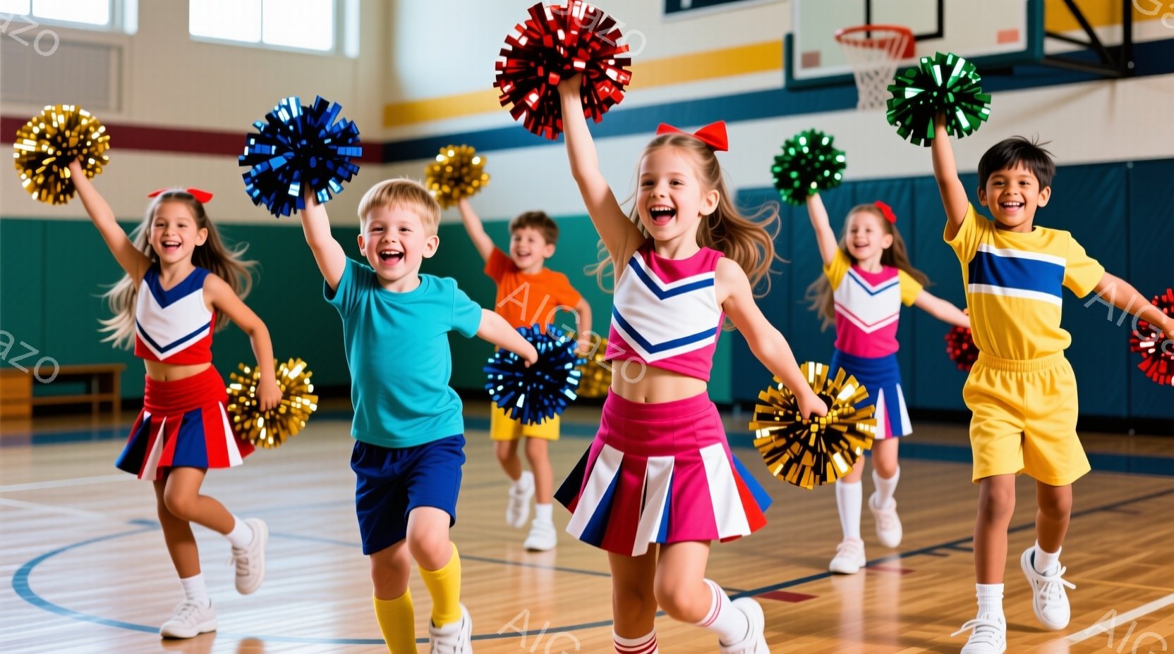 チアリーディングの練習をしている子供たちが体育館で写っています。ピンク、黄色、青、緑などのカラフルなユニフォームを着て、ポンポンを持ってジャンプしており、皆笑顔で活気に満ちています。背景にはバスケットボールのゴールが見え、体育館の床は木製で明るく、全体的にエネルギッシュで楽しげな雰囲気です。