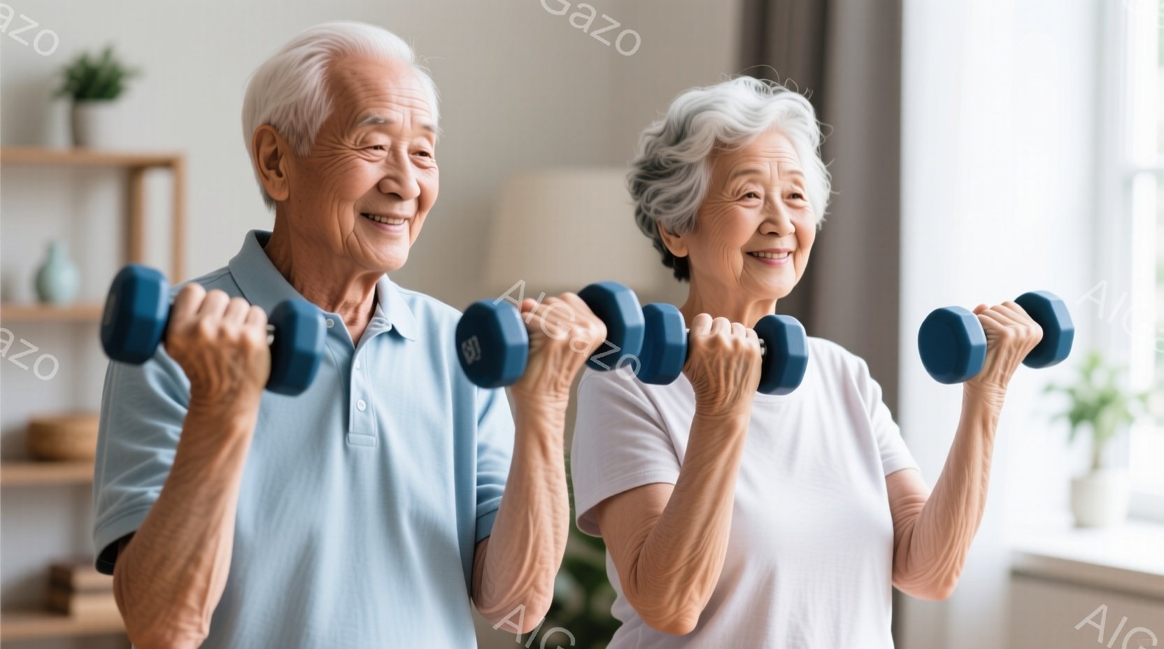 白髪の高齢の夫婦が、それぞれ青いダンベルを持ち、腕を横に広げて筋力トレーニングを行っています。女性は薄い紫色の長袖シャツ、男性は水色のポロシャツとベージュ色のズボンを着用しており、表情は真剣で集中しています。背景には、窓から差し込む光と木製の家具が見え、室内は明るく落ち着いた雰囲気です。