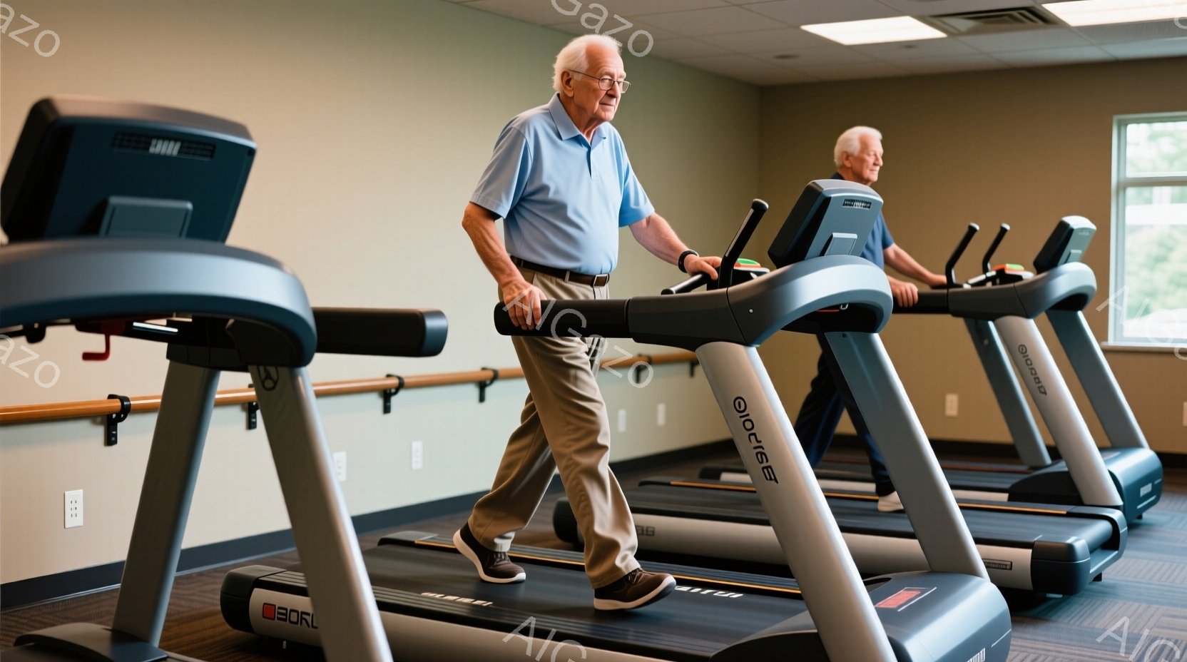 白髪で少し皺のある高齢男性がトレッドミルで運動している。彼は水色の半袖シャツとベージュ色のパンツを着用し、集中した表情で前を見ている。背景には他のトレッドミルや窓が見え、自然光が差し込み、活気のある運動施設の雰囲気が感じられる。