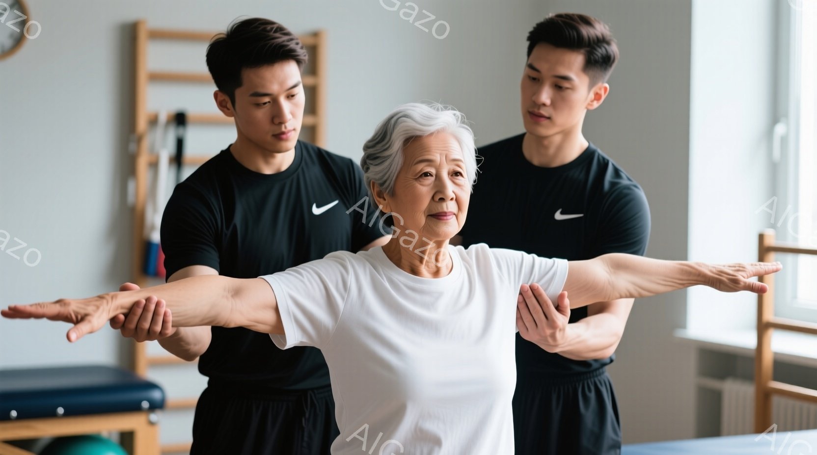 柔らかな身体を持つ老人が、年配の男性の指示に従って、健康的なストレッチを行っている。男性は厳密であり、老人は集中して活動している。穏やかな昼間の屋内空間で、背景には植物があり、室内の静かさが感じられる。
