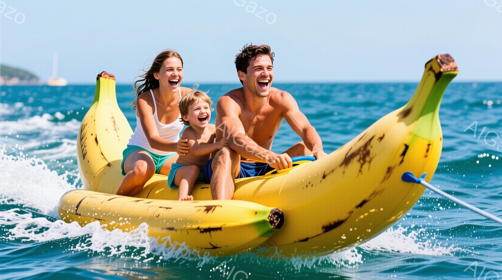 明るい青い海の上を、バナナ型のフロートに乗って女性と少年が楽しそうに進んでいる。女性は赤色の水着を着ており、少年は紺色の水着を着用し、ともに笑顔を見せている。背景には穏やかな波と遠くの山々が見え、晴れた空と鮮やかな海色が、楽しい夏の日の雰囲気を醸し出している。
