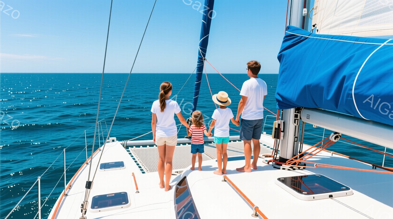 ヨットのデッキに立つ女性と少女、そして男性が描かれています。3人は皆白いシャツと短いズボンまたはスカートを着用し、手をつないでいます。背景には青い海と空が広がり、晴れた日の穏やかな航海を思わせる、平和でリラックスした雰囲気です。