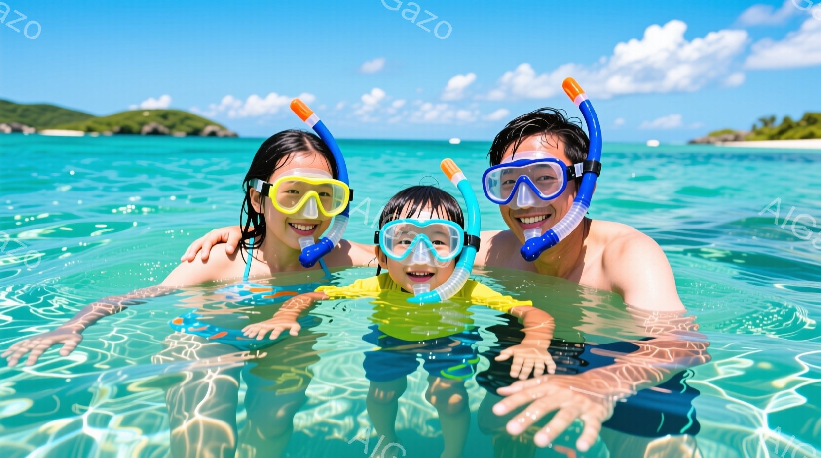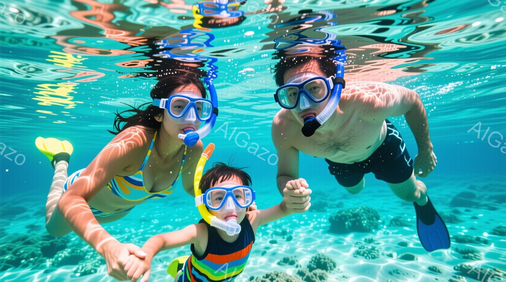 水中で、母と二人の子供がシュノーケリングを楽しんでいる様子が写っている。母親は黒髪で、水色のシュノーケリングセットを装着し、子供たちは明るい色のシュノーケリングセットと水着を着用している。背景には砂地と岩場が広がり、水面からの光が差し込み、穏やかで楽しい雰囲気を醸し出している。