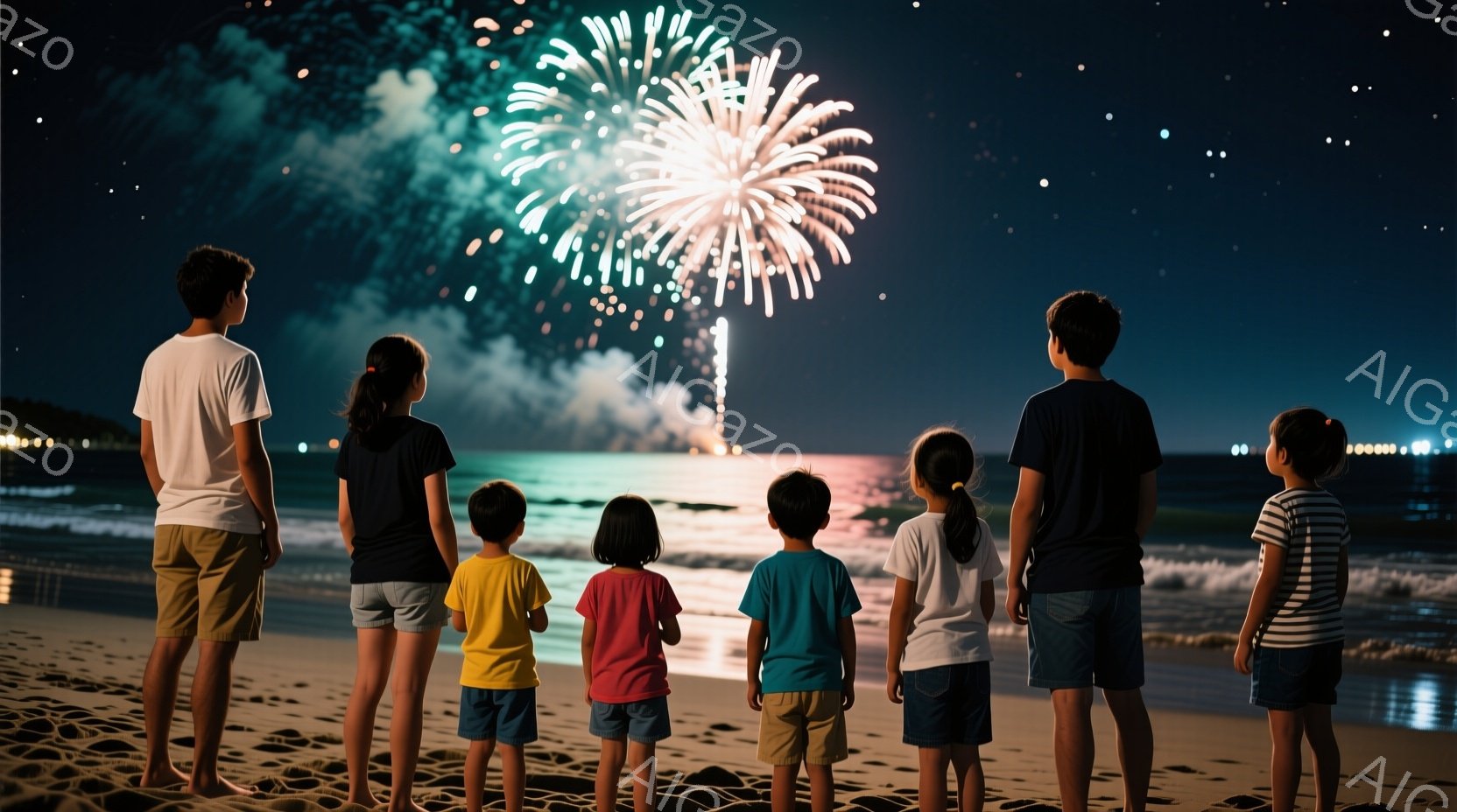 砂浜に立つ家族が花火を見上げています。子供たちはそれぞれ異なる色の服を着ており、一番年上の男の子は白いシャツ、二番目は赤いシャツ、女の子はピンクのワンピース、一番小さい男の子は青いシャツと短パン姿です。背景には暗い海と夜空、そして遠くに見える光る建造物があり、花火が夜空を明るく照らしています。