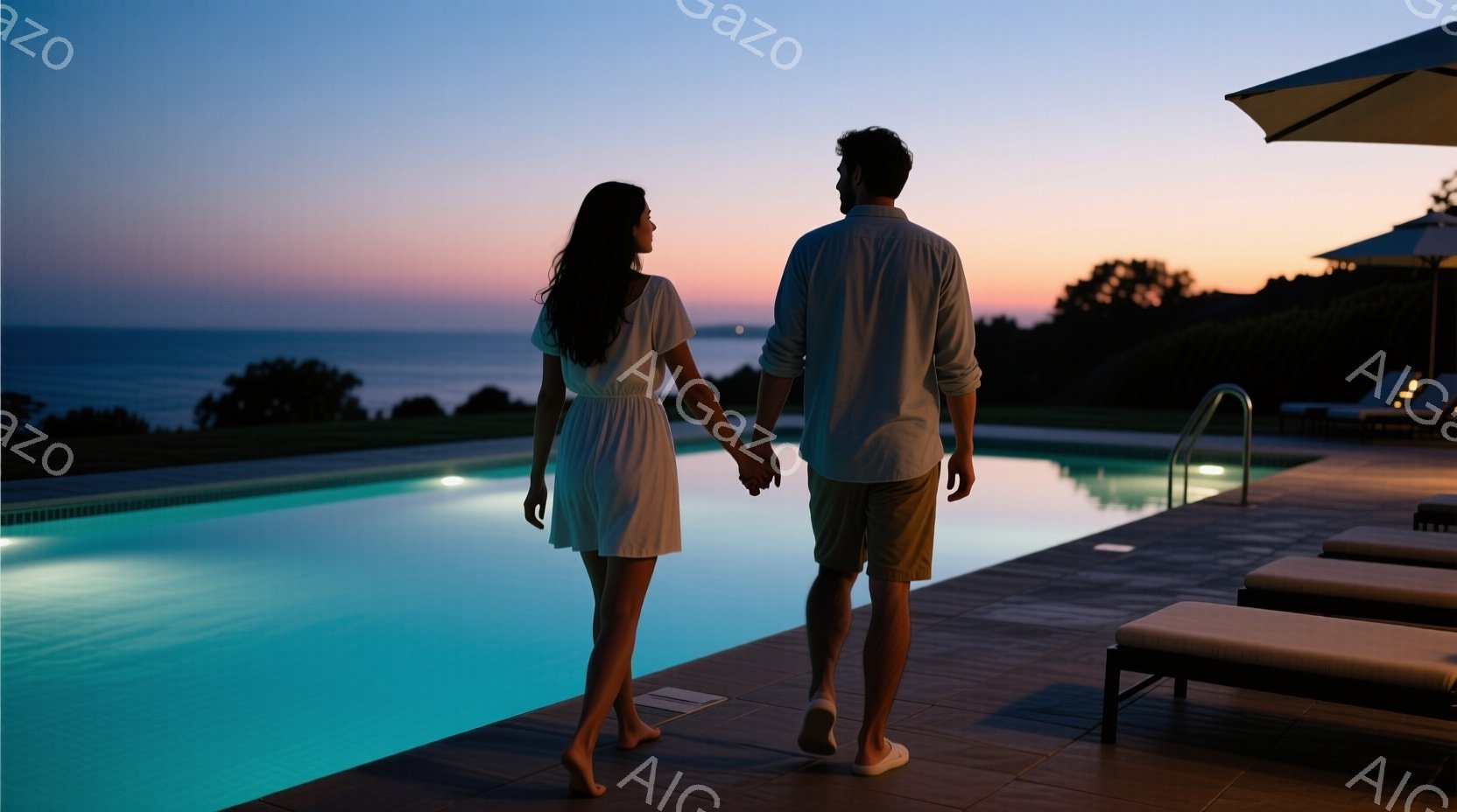 夕暮れ時のプールサイドを、ワンピースを着た女性とカジュアルなシャツとパンツの男性が手をつないで歩いている。水面に映るヤシの木の影が印象的で、背景には明るいオレンジと紫色の空が広がり、リラックスした穏やかな雰囲気を醸し出している。プールの周りにはリクライニングチェアが並び、静かで穏やかな時間が流れている様子が伺える。