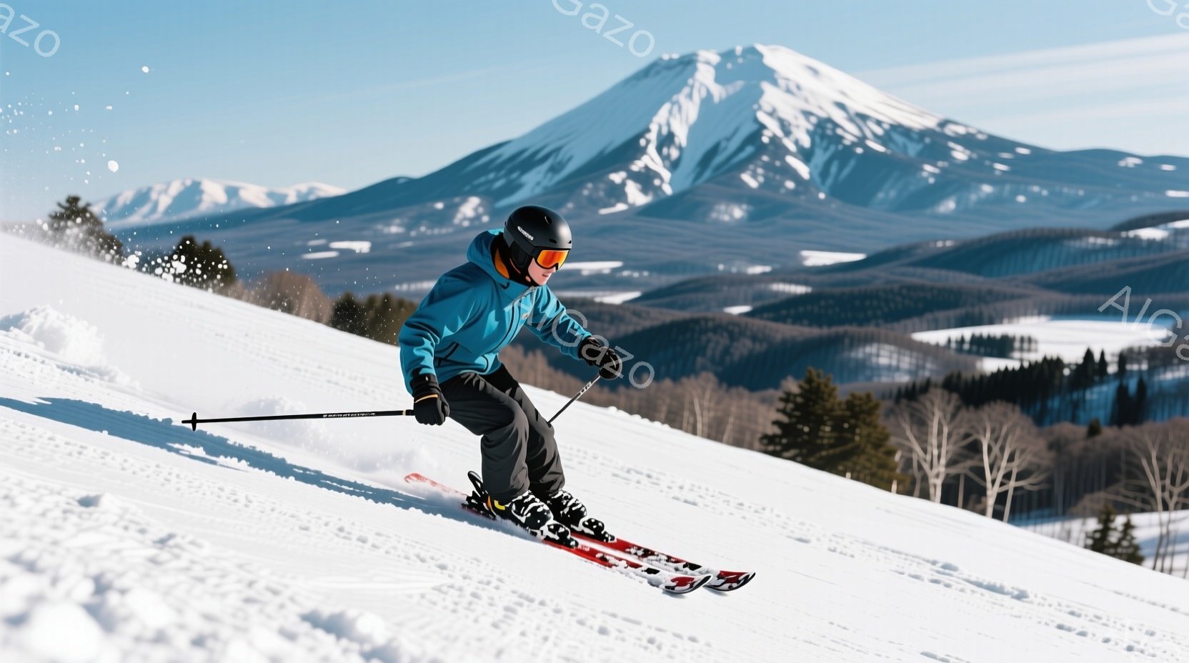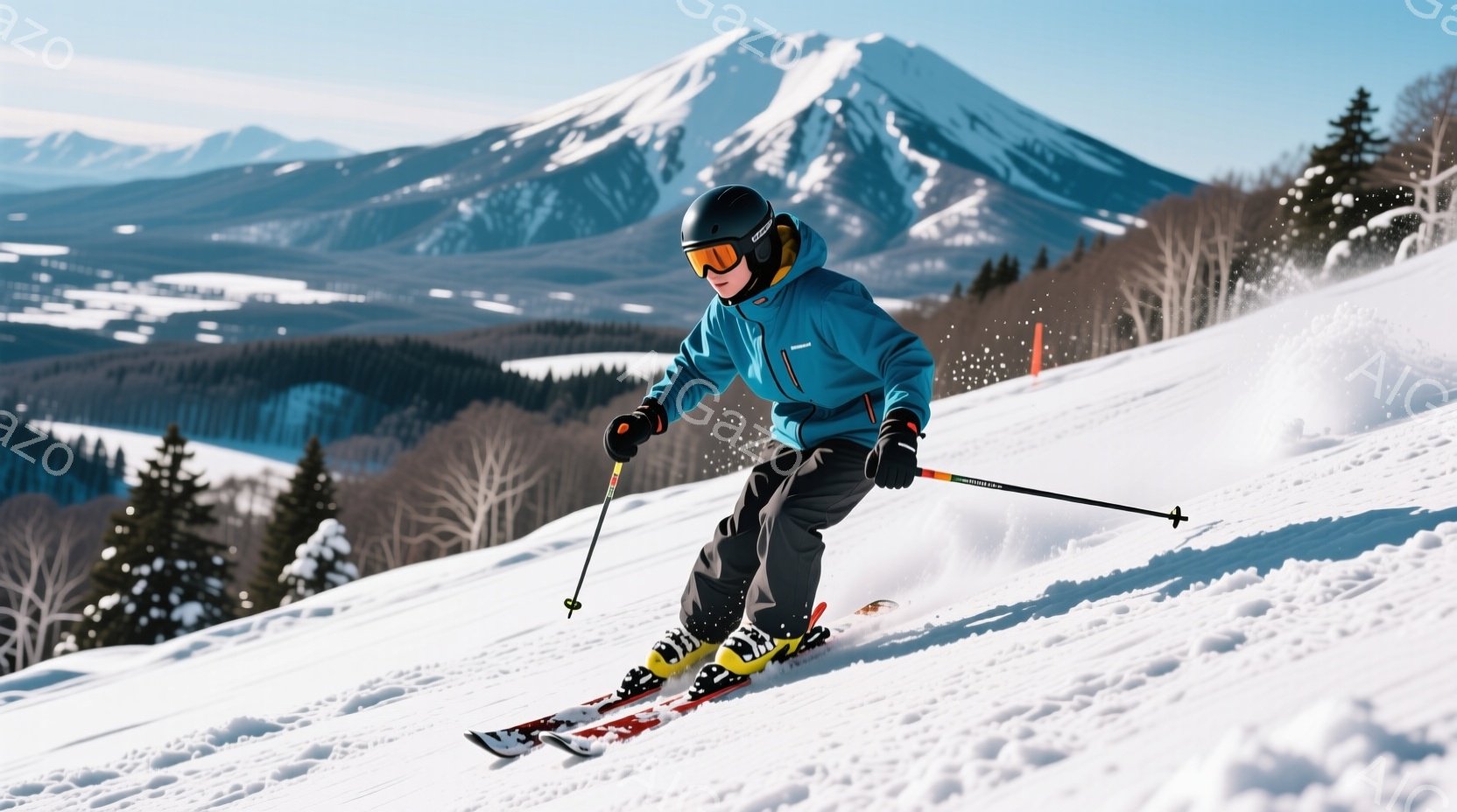 スキーヤーは青と黒のスキーウェアにヘルメットとゴーグルを着用し、雪の上を滑走している。彼は片足を前に出し、スキーポールを構え、バランスを取りながら斜面を下っている様子が伺える。背景には雪を被った山々と森林が広がり、晴天の下、爽やかな冬の雰囲気が漂っている。