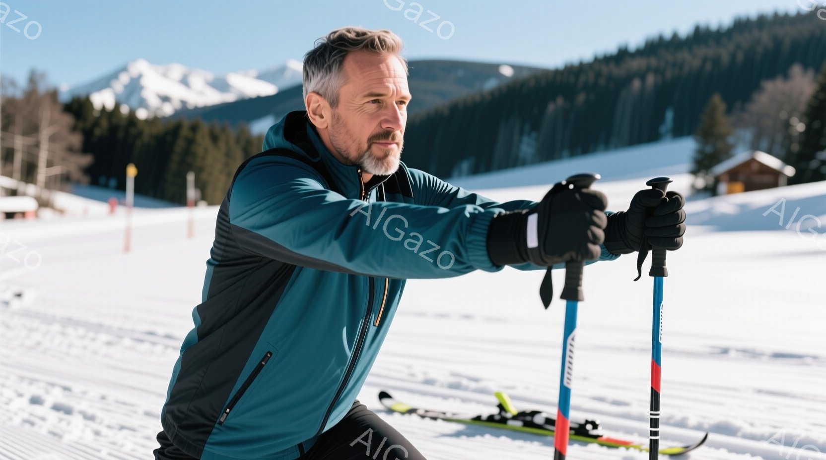スキーコースを走る男性が写っています。彼は濃い青色のジャケット、黒いズボン、手袋を着用しており、白髪混じりの髪と口髭を生やしています。背景には雪景色が広がり、遠くに山々が見え、晴天の下、活気ある冬の雰囲気が漂っています。