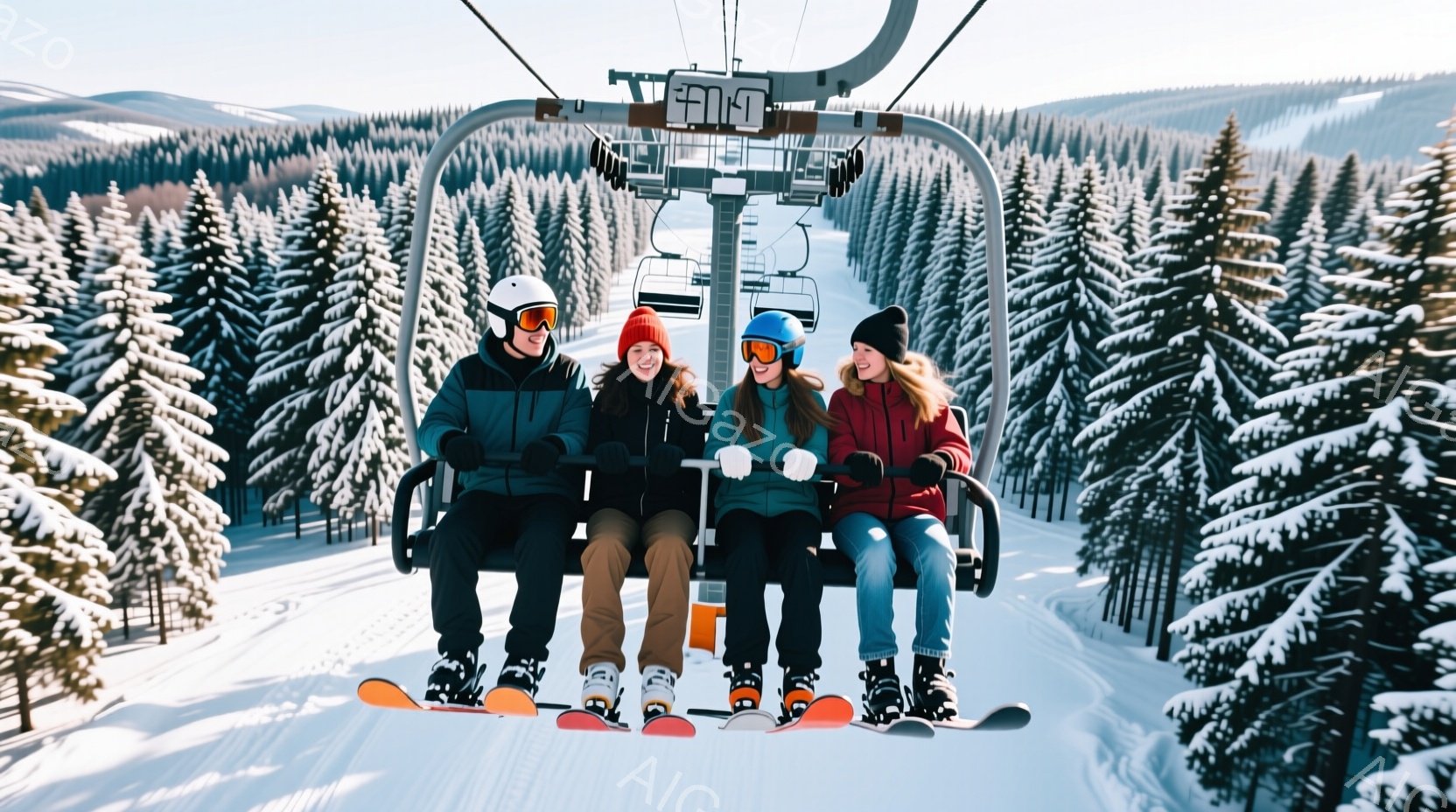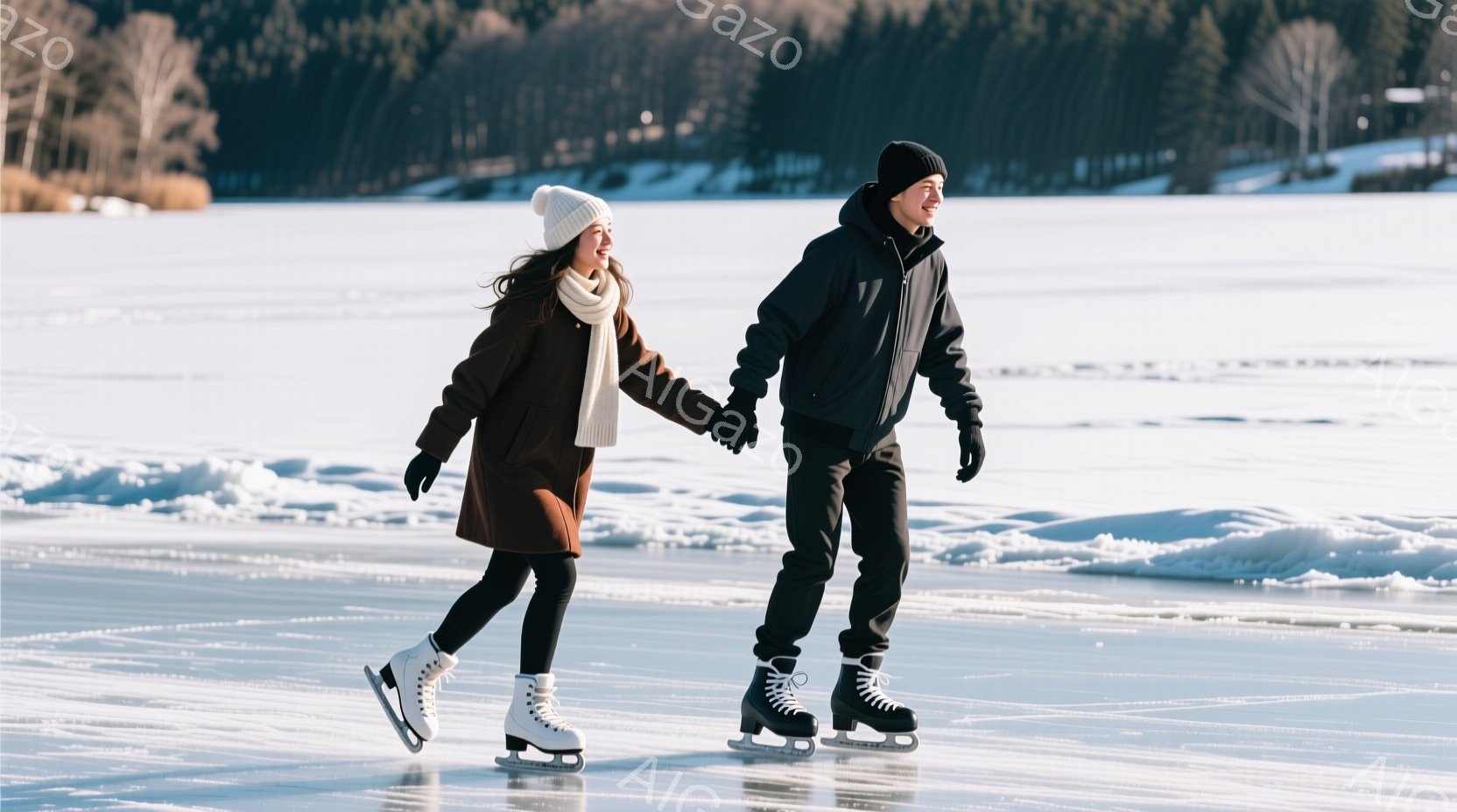 氷の上を男女が手をつないでスケートを楽しんでいる様子が写っている。女性はベージュ色のコートとニット帽を着用し、男性は黒いジャケットと帽子を着用しており、ともに笑顔で滑っている。背景には雪景色が広がり、遠くに木々が見え、晴天の下、冬の暖かな雰囲気が漂っている。