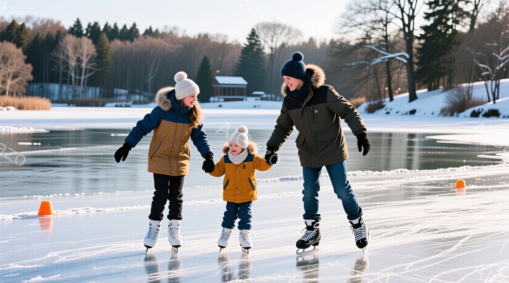 凍った湖の上を、父、母、そして子供が手をつないでスケートを楽しんでいます。家族は皆、防寒性の高い冬のコートと帽子を着用し、スケート靴を履いており、笑顔で楽しんでいる様子が伺えます。背景には木々が立ち並び、晴れた冬空の下、穏やかな雰囲気が漂っています。
