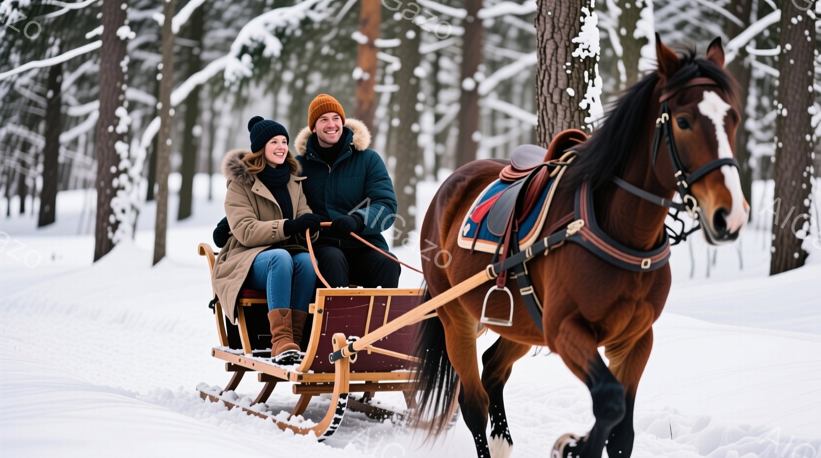 雪景色の中で、男女が馬に引かれるソリに乗っている様子が描かれている。女性は赤いニット帽と濃い青色のジャケット、男性は黒いニット帽とジャケットを着ており、共に笑顔で楽しんでいるようだ。背景には雪をまとった木々が立ち並び、冬の静かで幻想的な雰囲気を醸し出している。