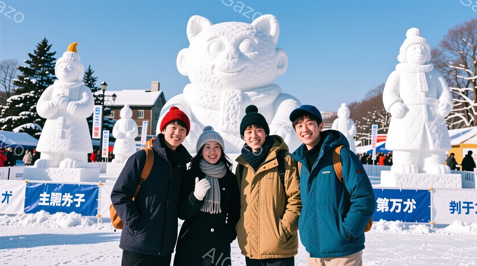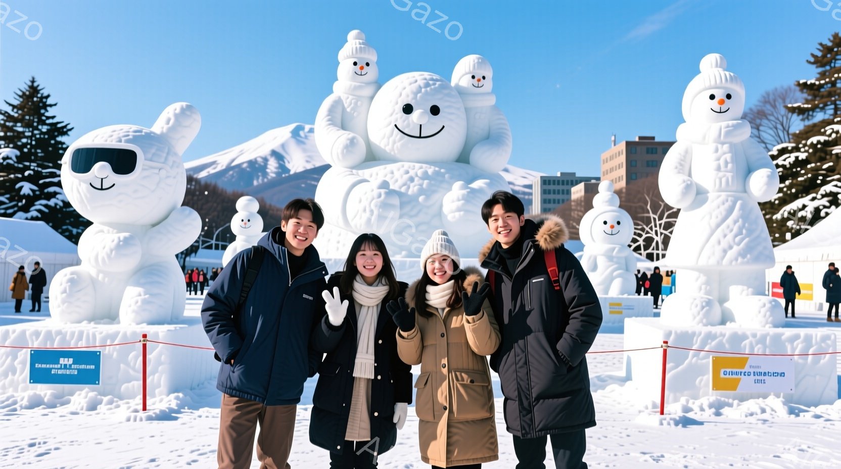 4人の若い女性と男性が雪像の前で並んで写っています。女性たちはカラフルな冬のコートを着て、笑顔で手を振っており、男性は濃い青色のコートを着ています。背景には大きな雪像や建物、雪景色が広がり、晴天の下、明るく楽しい雰囲気が伝わってきます。